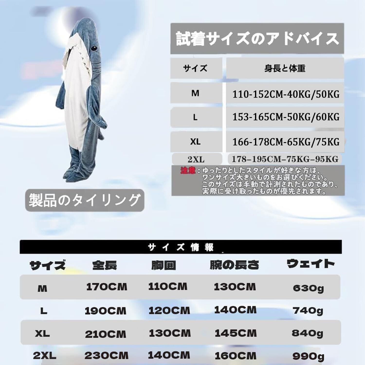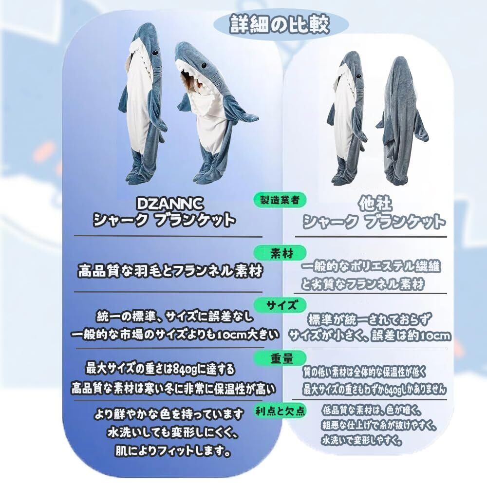 【四季対応&サメ アニマルブランケット 寝袋】: 冷たい冬や寒い季節には暖かさを提供し、夏には軽やかな涼しさを楽しむことができる、四季に対応したブランケットです。一年中快適に使用できます。サメ毛布:(Mサイズ)身長155cm以下、体重50kg以下の大人/子供用、(Lサイズ)身長168cm以下、体重65kg以下の大人用、(XLサイズ)身長178cm以下、体重75kg以下の大人用。