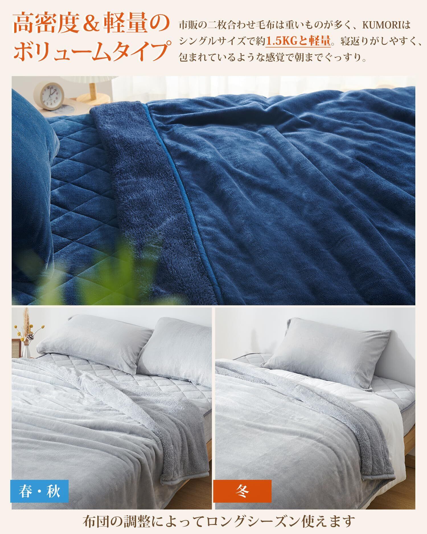 クモリ(Kumori) 2枚合わせ 厚手 毛布 シングル 冬用 あったか 中綿入り 襟付き ブランケット フランネル 三層構造 吸湿発熱 もうふ 保温 軽量 ふわとろ 掛け毛布 洗える 毛抜けない 静電気防止 暖かい ボリュームタイプ 合わせ毛布 ネイビー 140X200cm