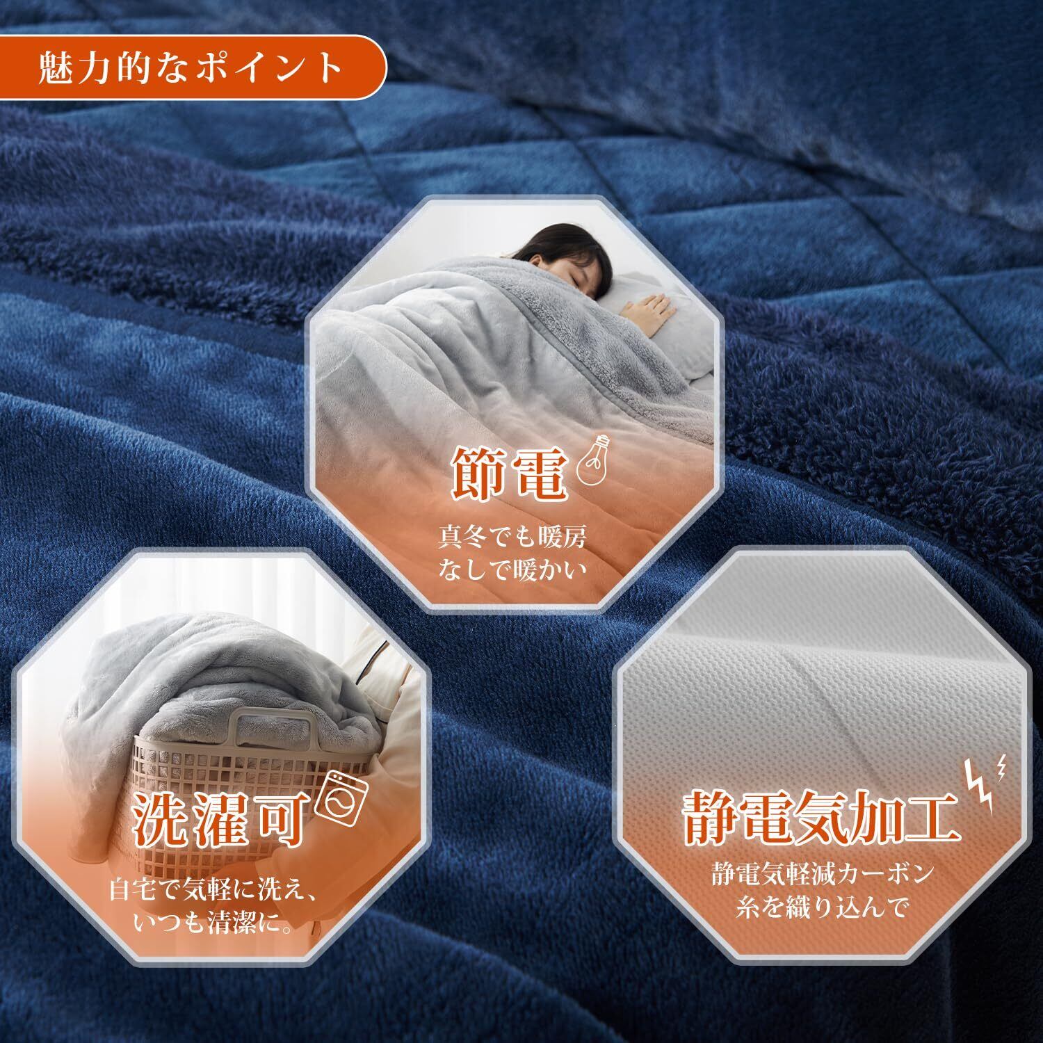 「機能性と便利さを兼ね備え」1.静電気軽減加工があり。2.洗濯機で丸洗え、お手入れ簡単。3.春秋には毛布1枚で、冬には布団と併用して長期間に使える。4.丁寧に仕上げ、毛抜けが少ない。5.エコテックス認証済みで、人に優しい。