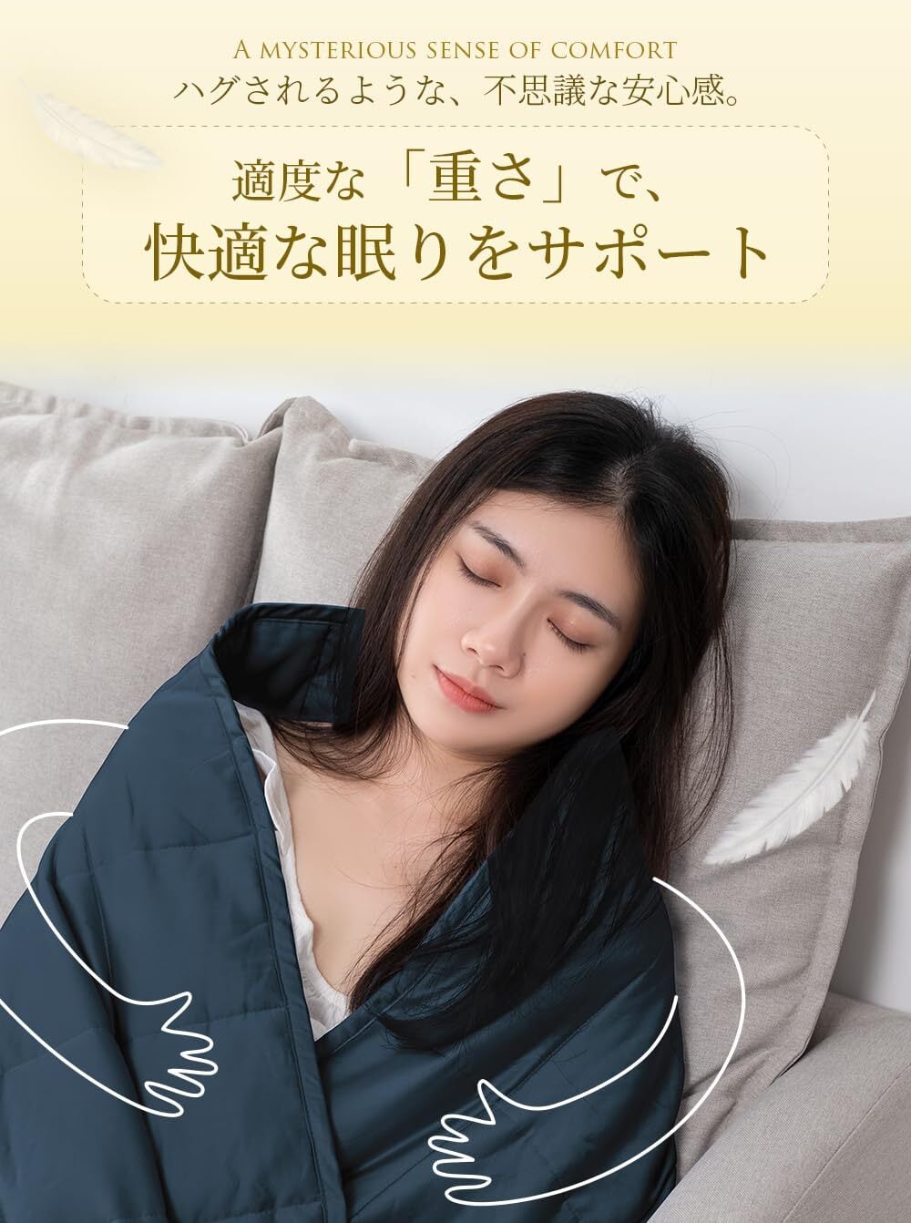【機能性】抱かれている感覚を出すために人の体重の10~12%になるように設計されています。重みのある布団には、まるで繭の中にいるような包容感があり、興奮状態や生理喚起の状態を抑え、入眠・熟睡しやすくなります。