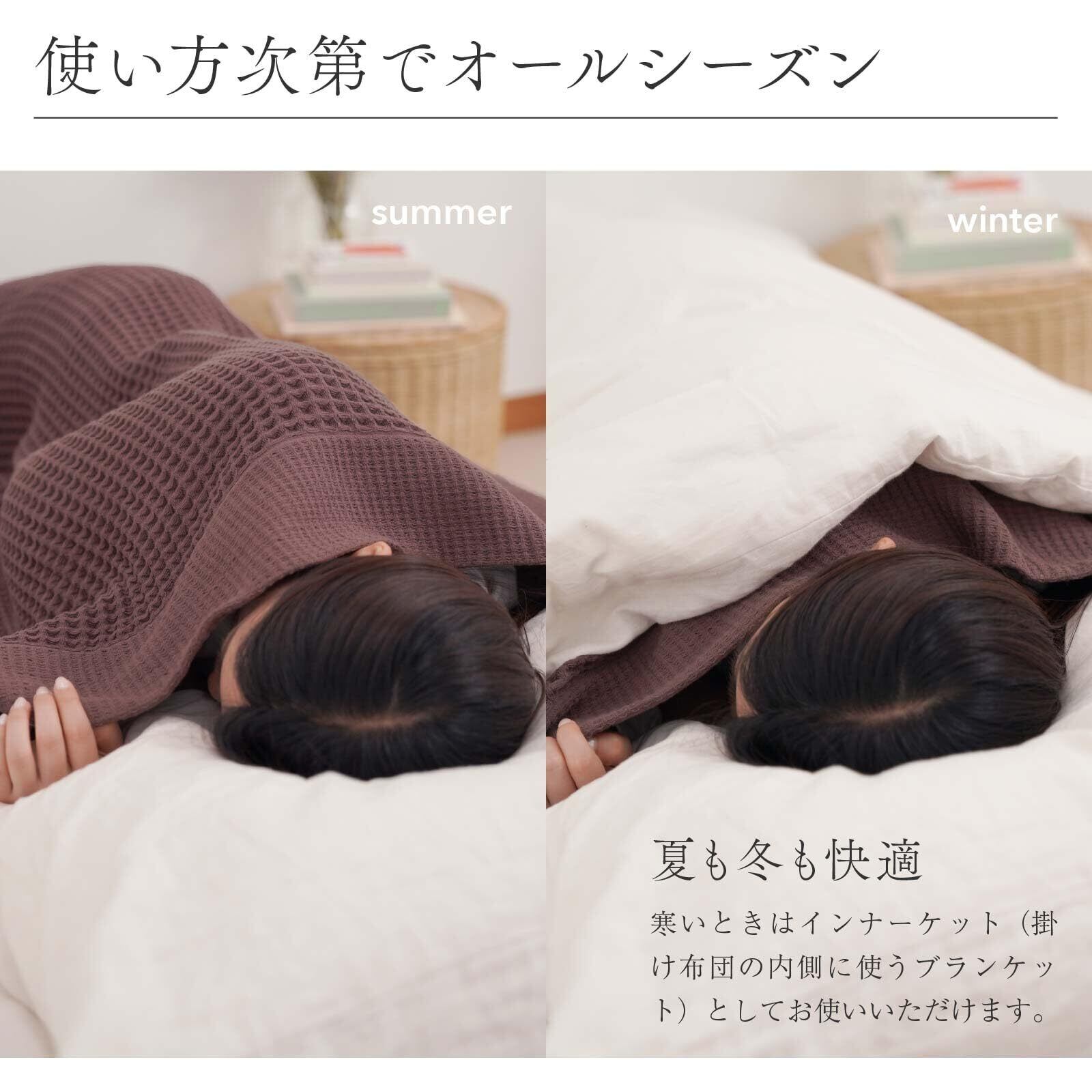 【寒い季節も使用可能】 秋冬はブランケットや毛布の代わりとしても。凹凸でできる空気の層が保温性の役割も果たし、冬場の羽毛布団のインナーケット(中掛け毛布)として使用するのがおすすめです。天然素材で静電気が起きづらく、ほどよい厚みでさらっと快適に過ごしていただけます。