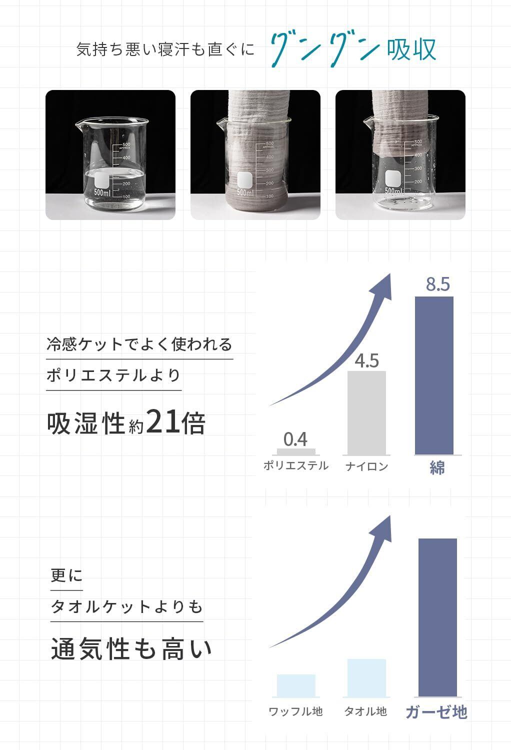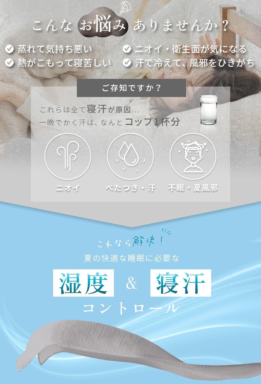 【優れた通気性】汗でべたつく肌をさらりと快適に。吸水性、通気性ともに優れているので、汗ばむ夏の夜でも快適にお使いいただけます。