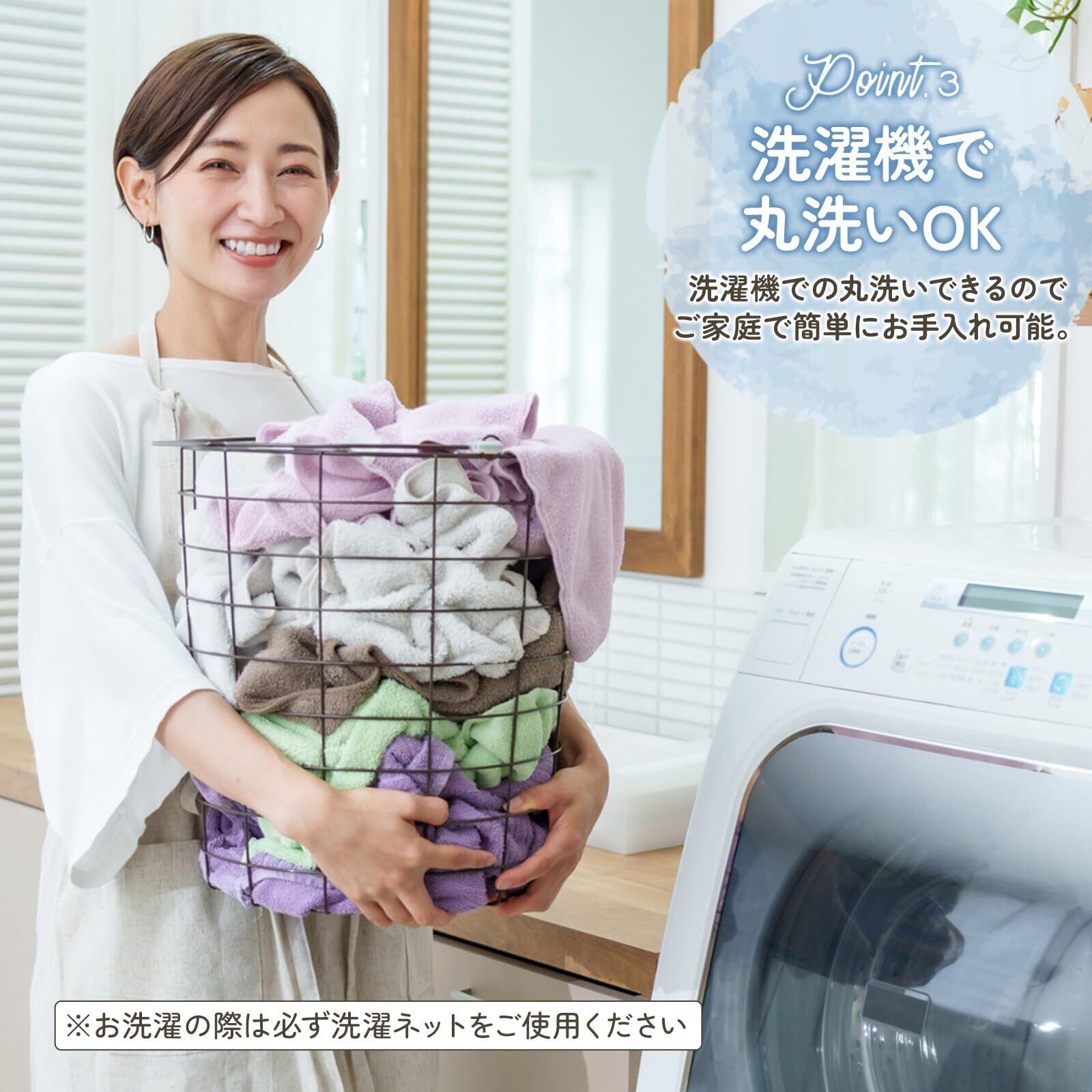 【お手入れ方法】洗濯機をご使用の際は、必ず洗濯ネットをご利用ください。中性洗剤をご使用いただき、漂白剤や柔軟剤の使用はお避けください。