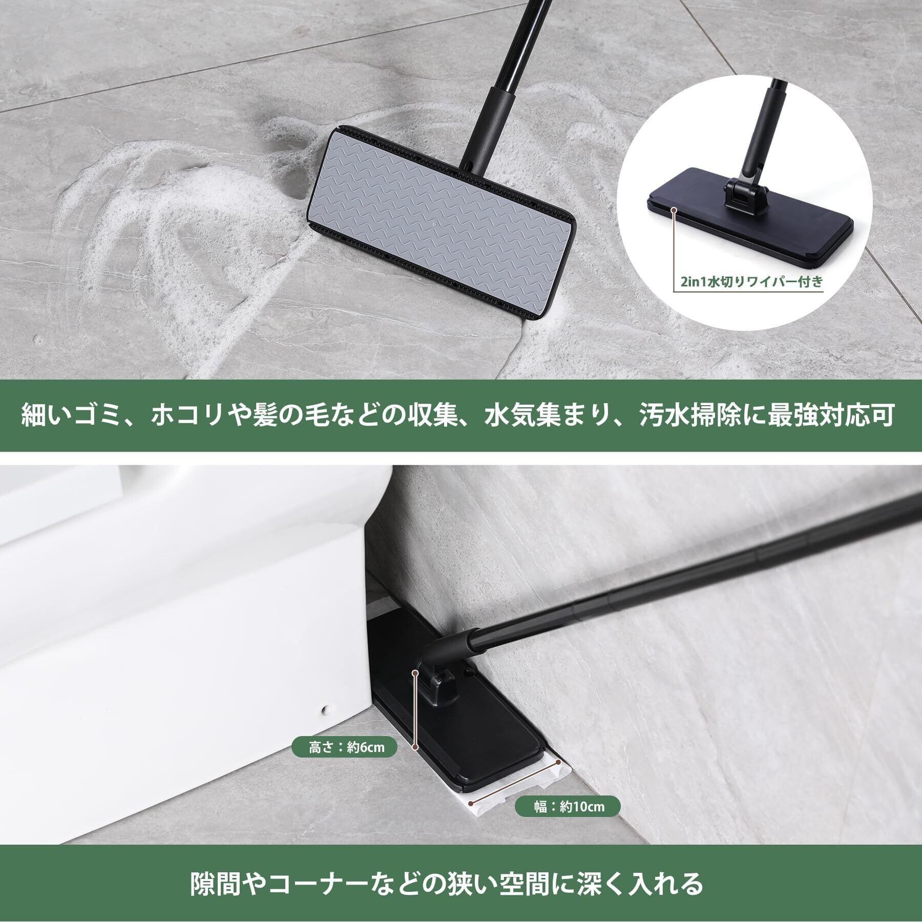 【2in1多機能水切りワイパー】:水切りワイパー付きのデザインは、より良い細いゴミ、ホコリや髪の毛などを収集することができます。更に、窓、鏡、壁、地面、天井の水気集まり、汚水掃除もかなり簡単に実現できます。
