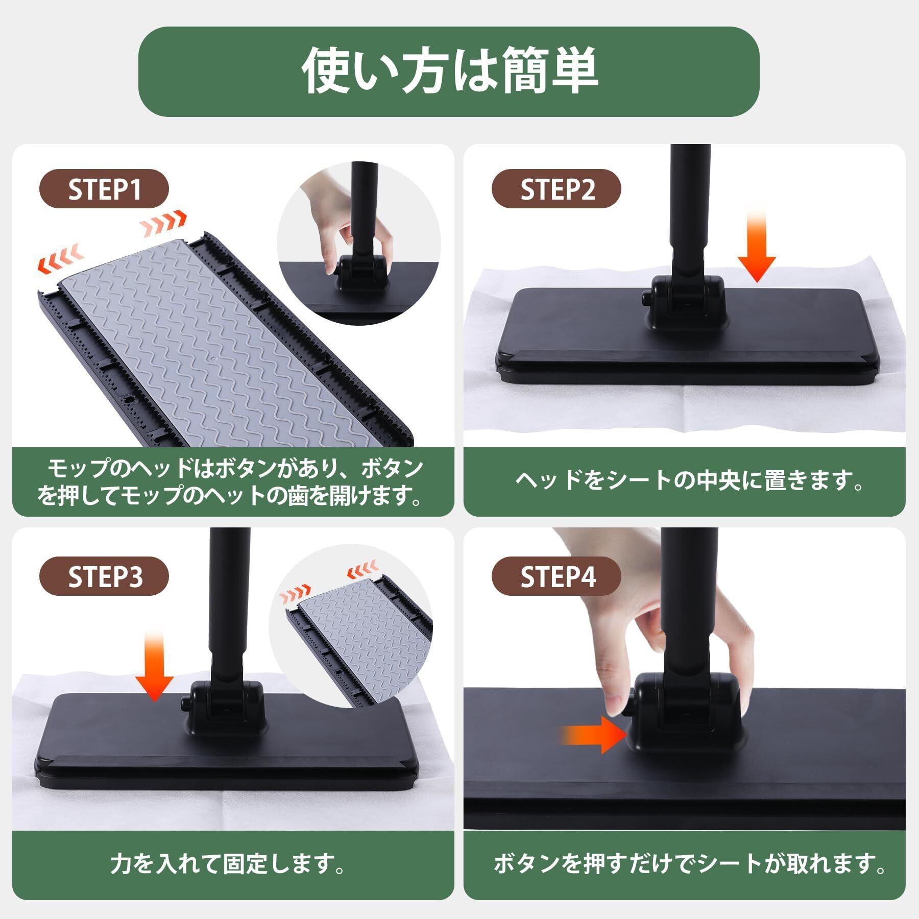 【自動で雑巾挟めるモップの取り扱い】:a.シートと雑巾の取付け方法:フロアワイパーのヘッドをシートと雑巾の上に置いて、ハンドルを床面と垂直にしたまま、床面方向へ"ガチン"と聞こえるまで押して、シートと雑巾がしっかりと挟み込めます。b.シートと雑巾の取外し方法:フロアワイパー ヘッドの側面に付いているボタンを押すと、簡単にシートと雑巾を取替えることができます。
