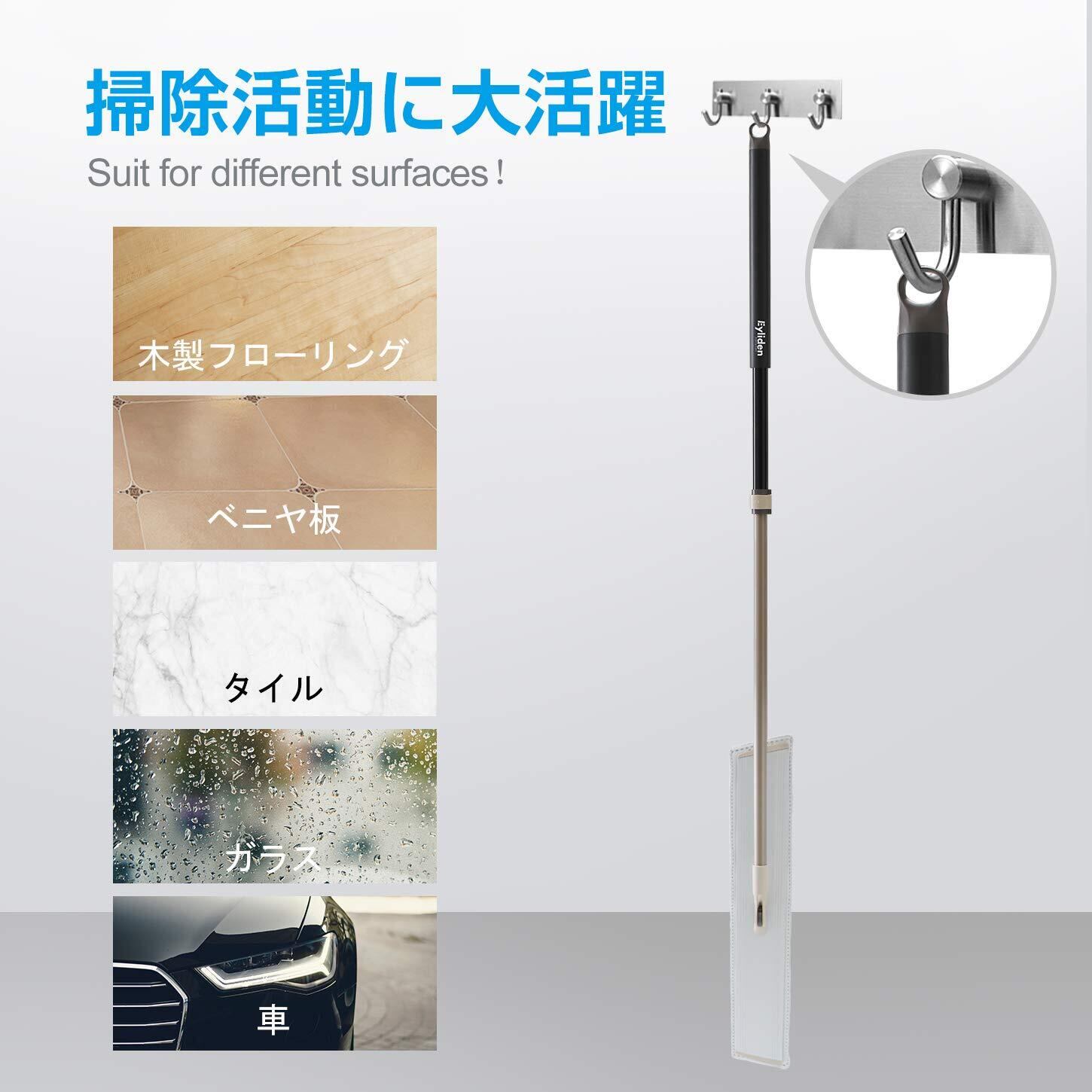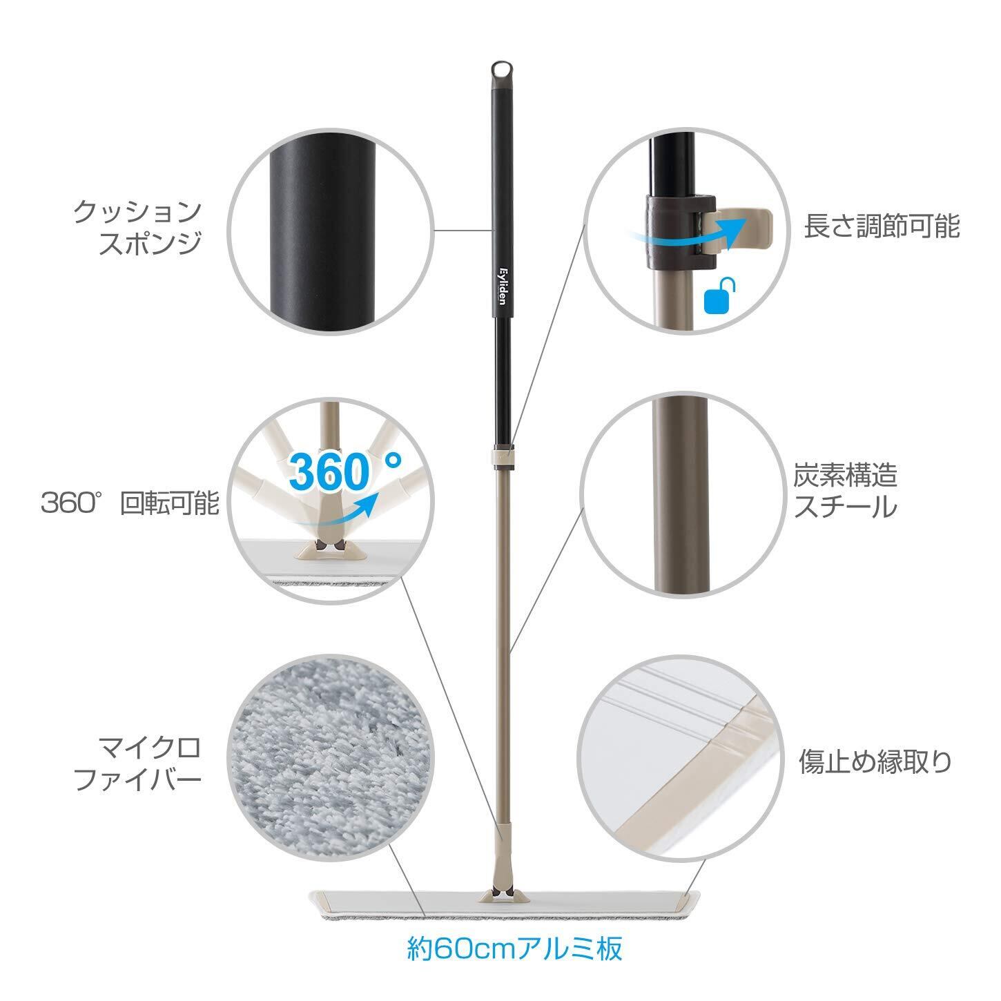 フロアモップ Eyliden. モップ 掃除モップ 業務モップ フローリング ワイパー 掃除 幅広い 乾拭き 水拭き 床に優しい 回転 マイクロファイバー クロス2枚 取替 便利 コンパクト スクレーパー ベーシック 腰に負担なし 約82.5~132cm伸縮可能