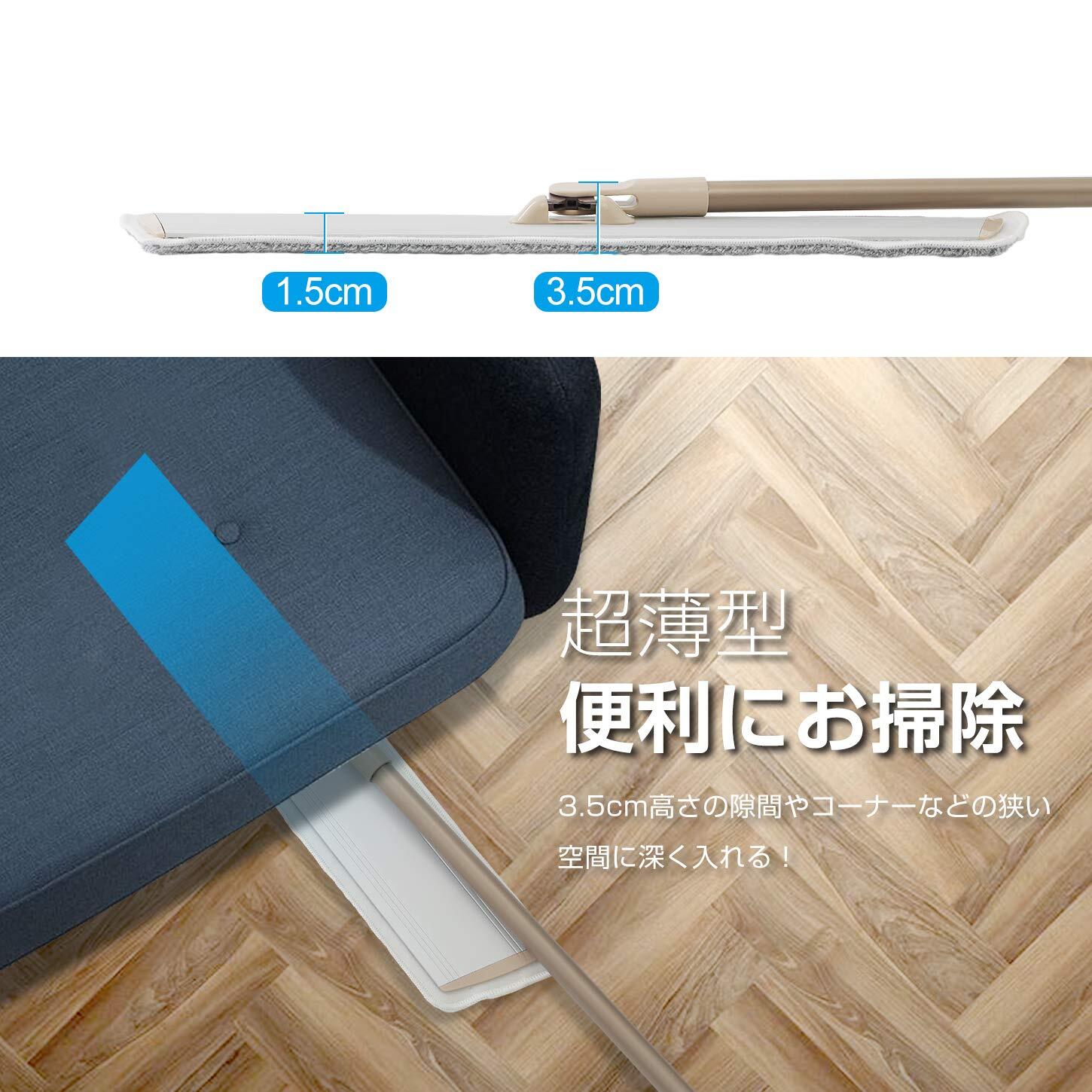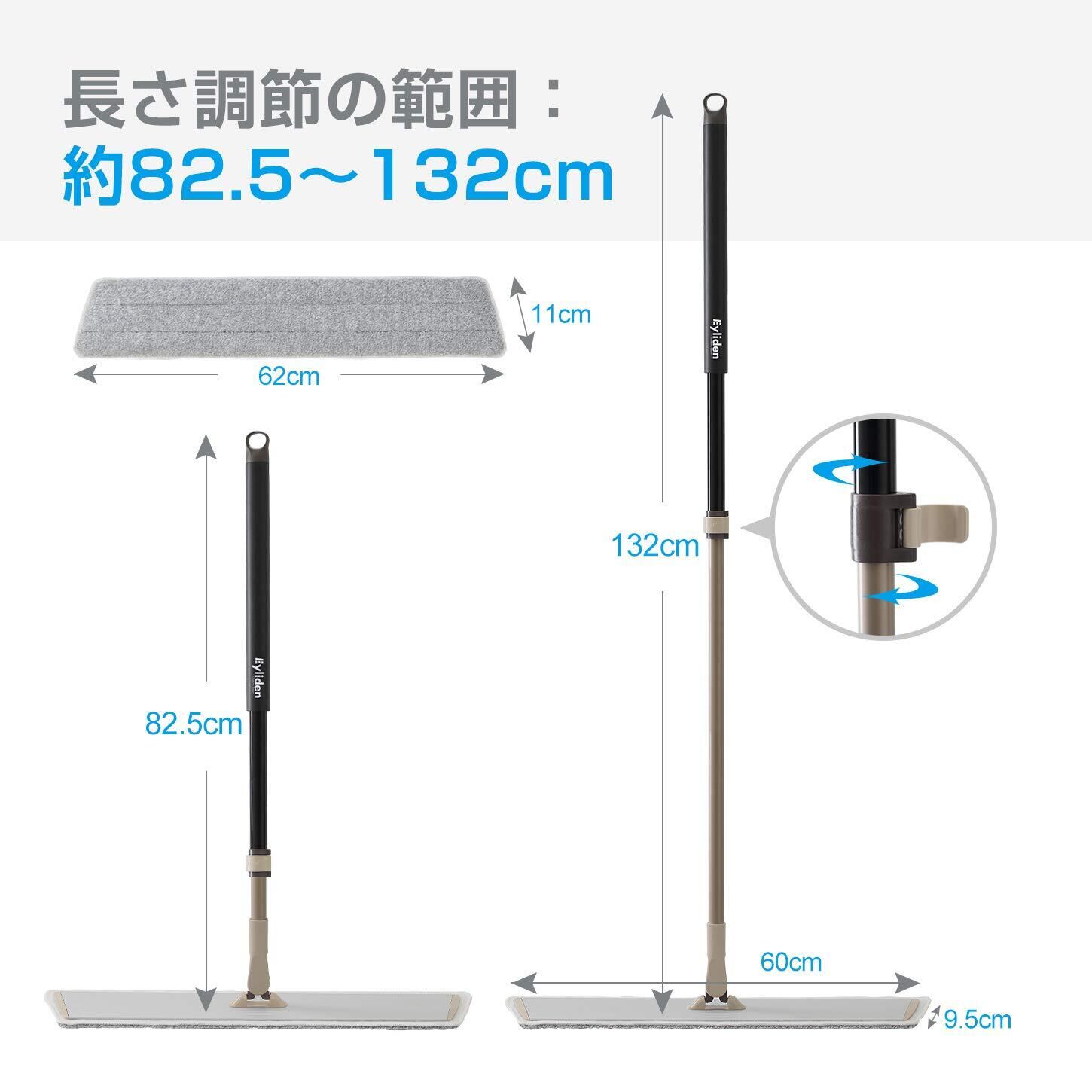 【いいデザイン】:ハンドルの長さ約82.5~132cm範囲で自由に長さ調節することができ、腰を大変に曲げる必要なくお気軽に使用できます。60cmのアルミ板が幅広くて、広い部屋でも余裕あり掃除が実現できて、床掃除の時間も節約できます。