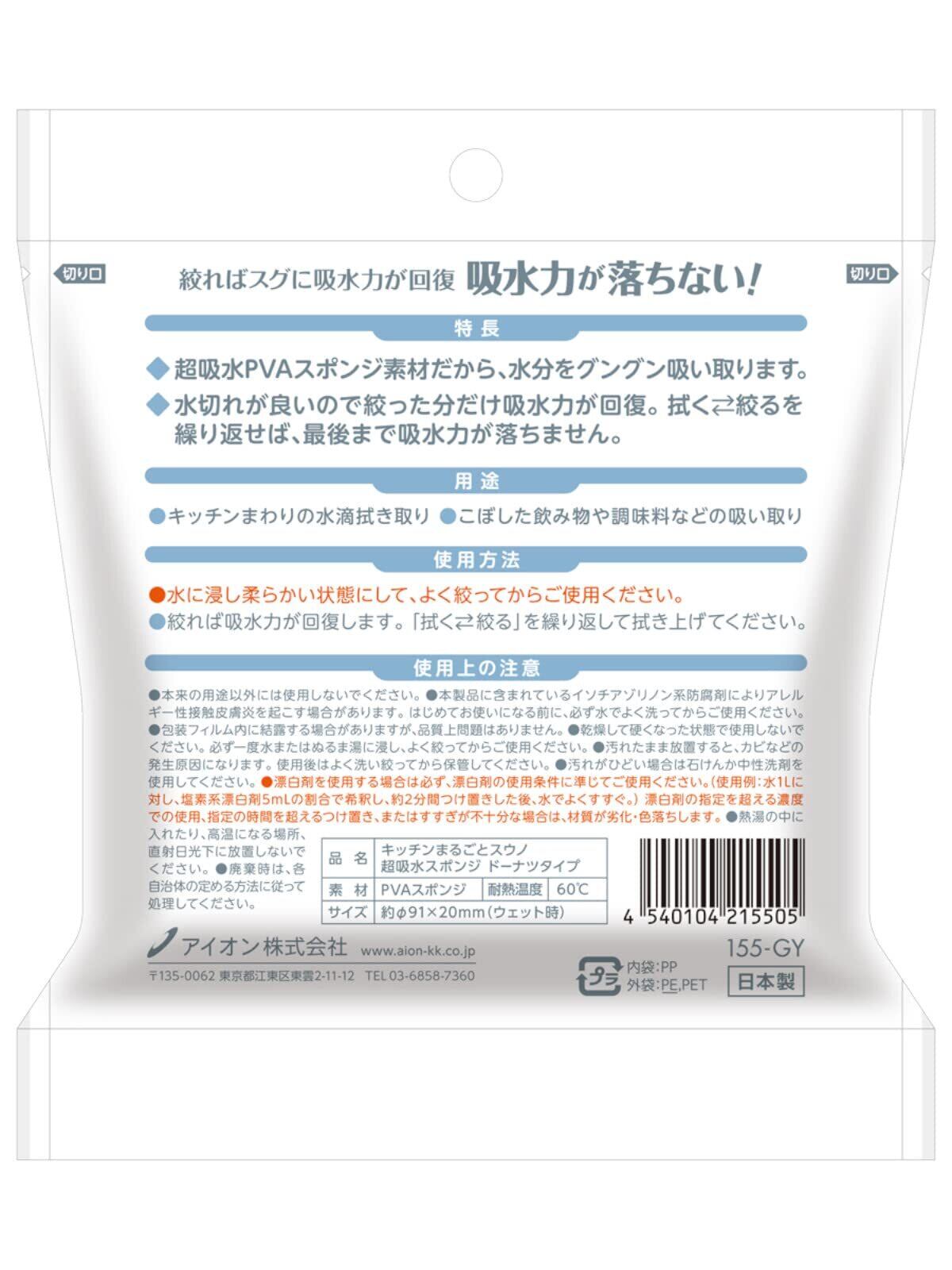 アイオン(Aion) 超吸水スポンジ ドーナツタイプ グレー 1個入 蛇口にフィット 日本製 PVA素材 絞ればすぐに吸水力が回復 キッチンまるごとスウノ 155-GY