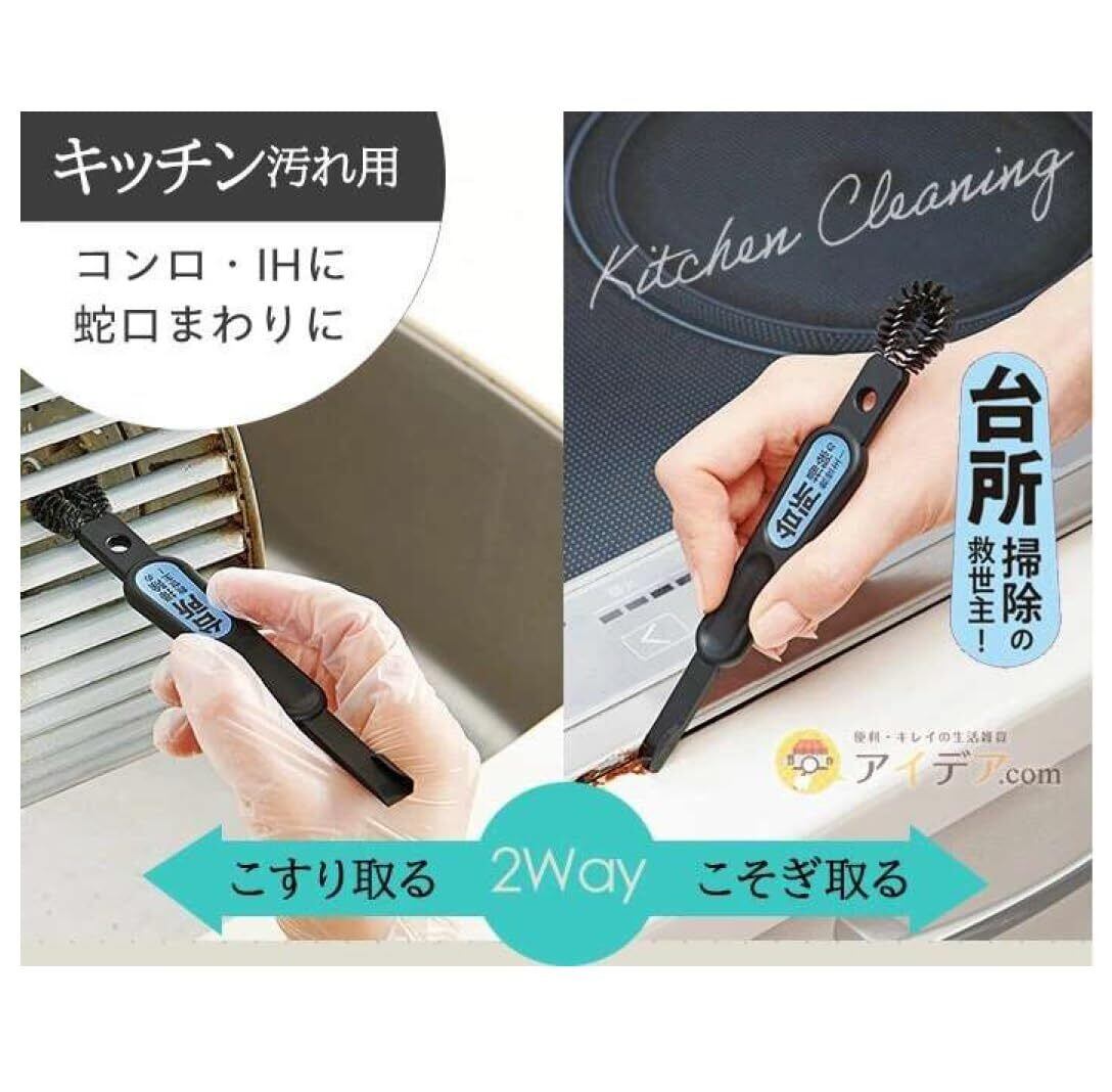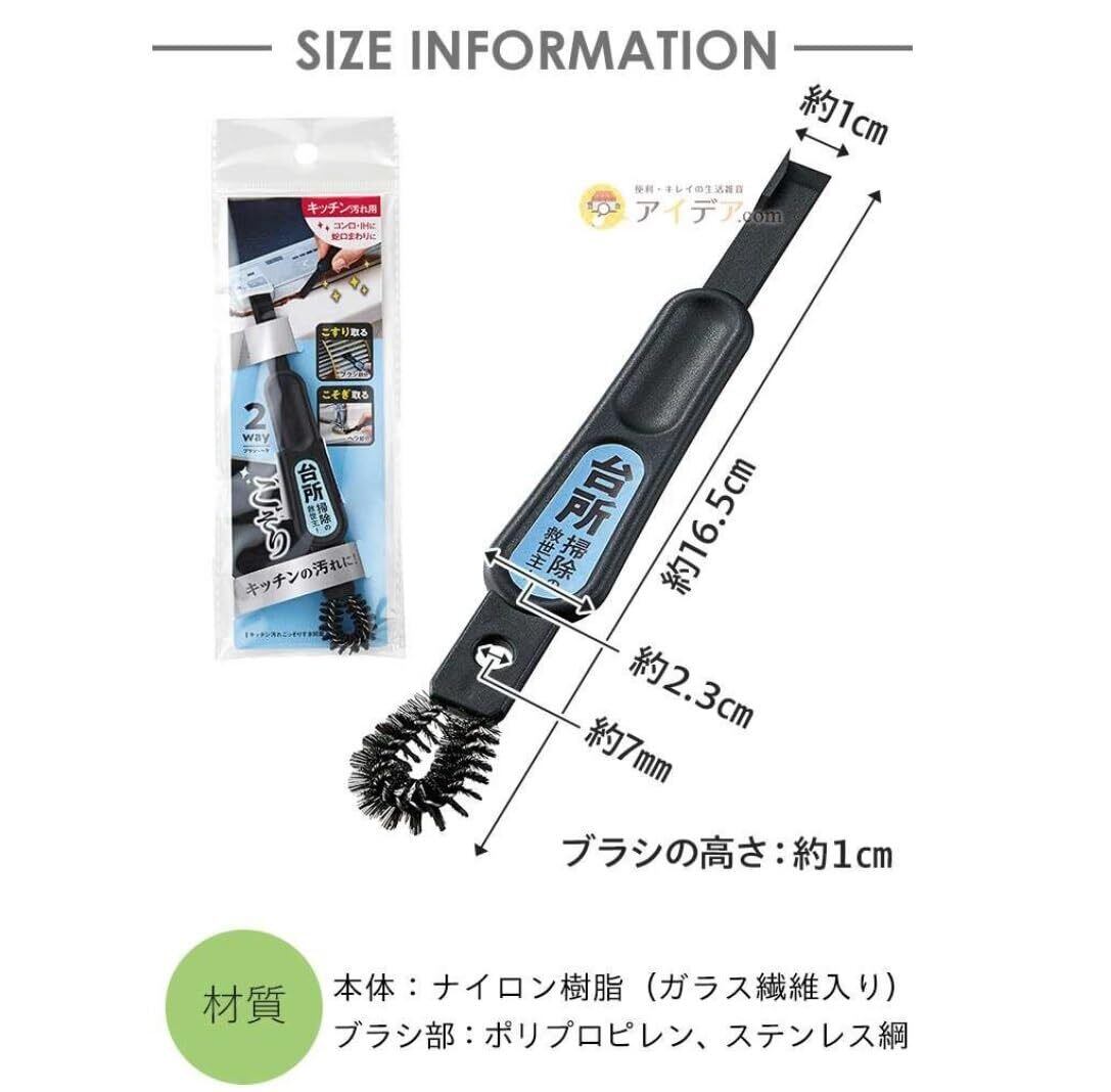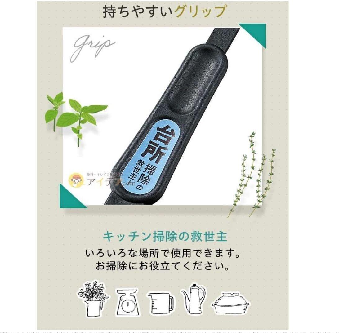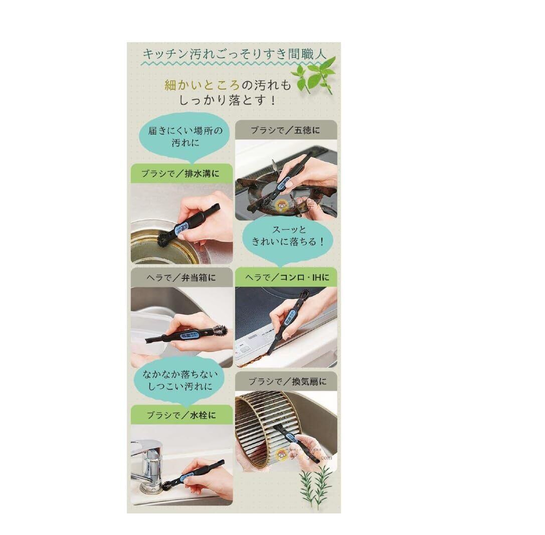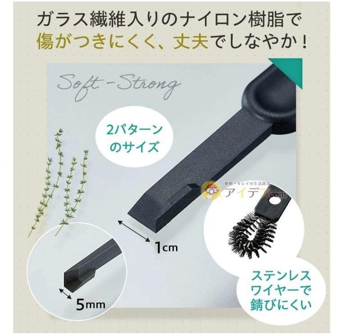 台所掃除の救世主。 コンロやIH、蛇口まわりのキッチン汚れに最適です。 ブラシ部分はこすり取り、ヘラ部分はこそぎ取ることができ、細かいところの汚れもしっかり落とします。 排水口や五徳の汚れにはブラシを、コンロやIHの汚れにはヘラを使えます。さらに、お弁当箱洗いにも。 ガラス繊維入りのナイロン樹脂で傷がつきにくく丈夫です。
