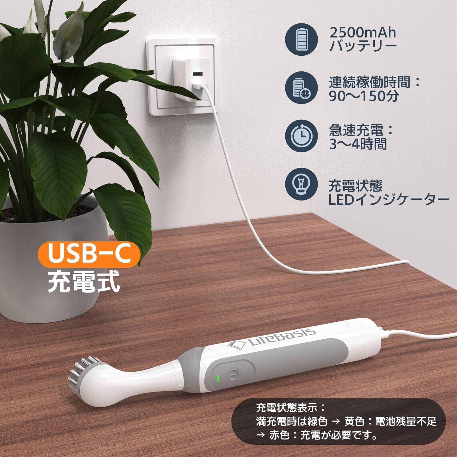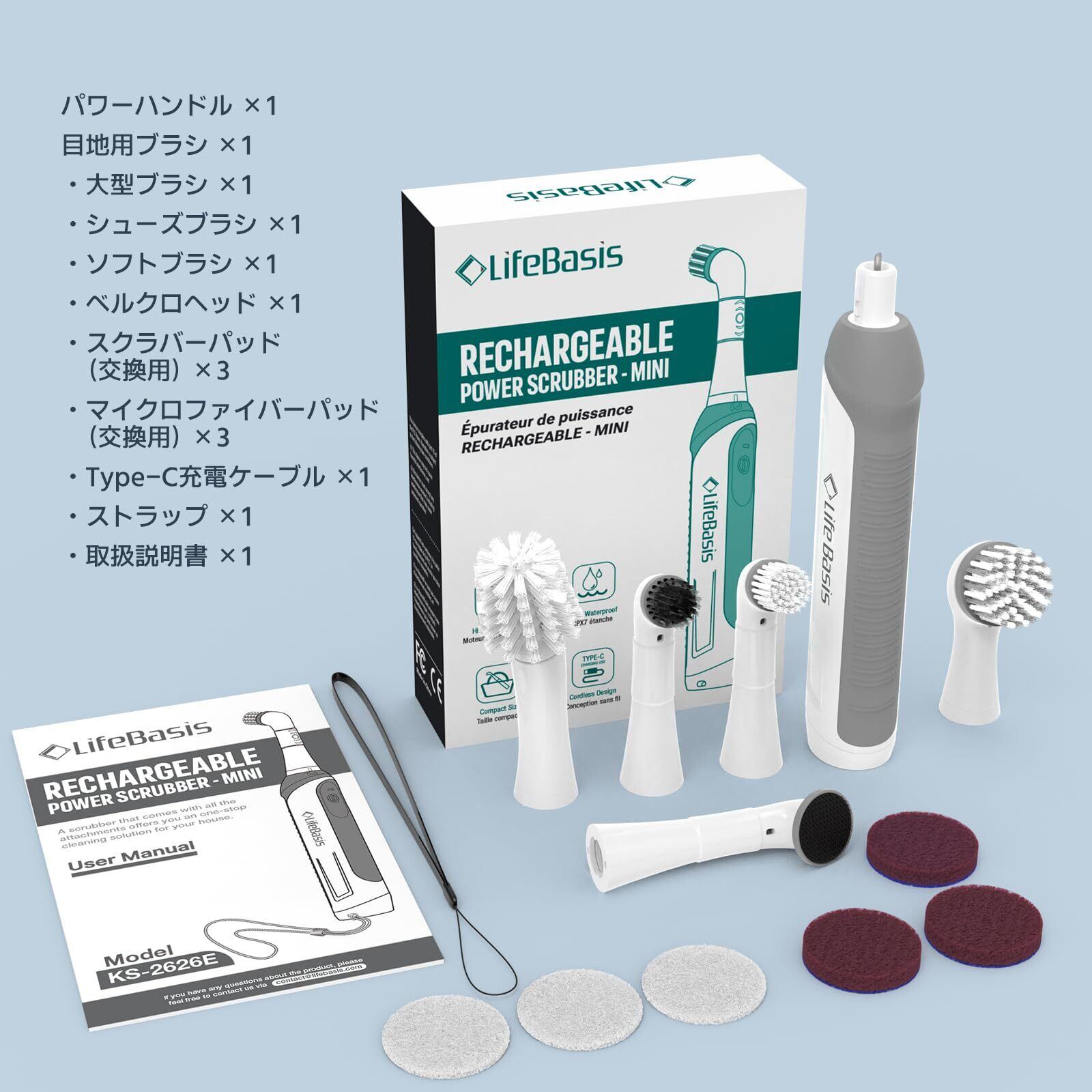 Lifebasisバスポリッシャー 電動お掃除ブラシ 浴室ブラシ お風呂床掃除用ブラシ ポリッシャー 電動 掃除ブラシ 浴室清掃 マグネット収納 壁面取付 持ちやすい グリップ付き 正規品 トイレ 浴槽 床 窓 おふろ 車 ベランダ 玄関 掃除 道具 凹凸床対応
