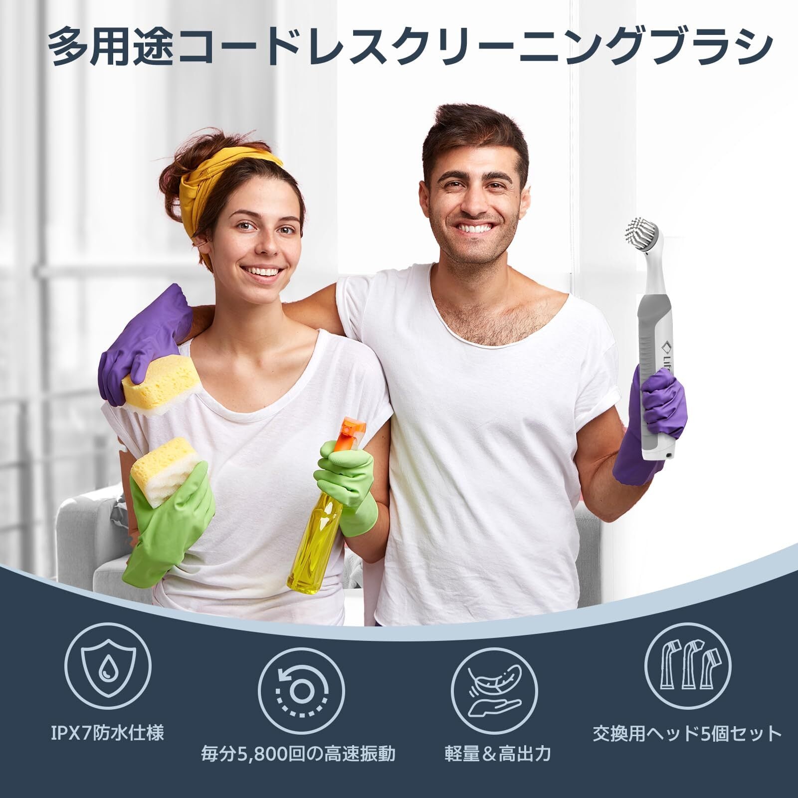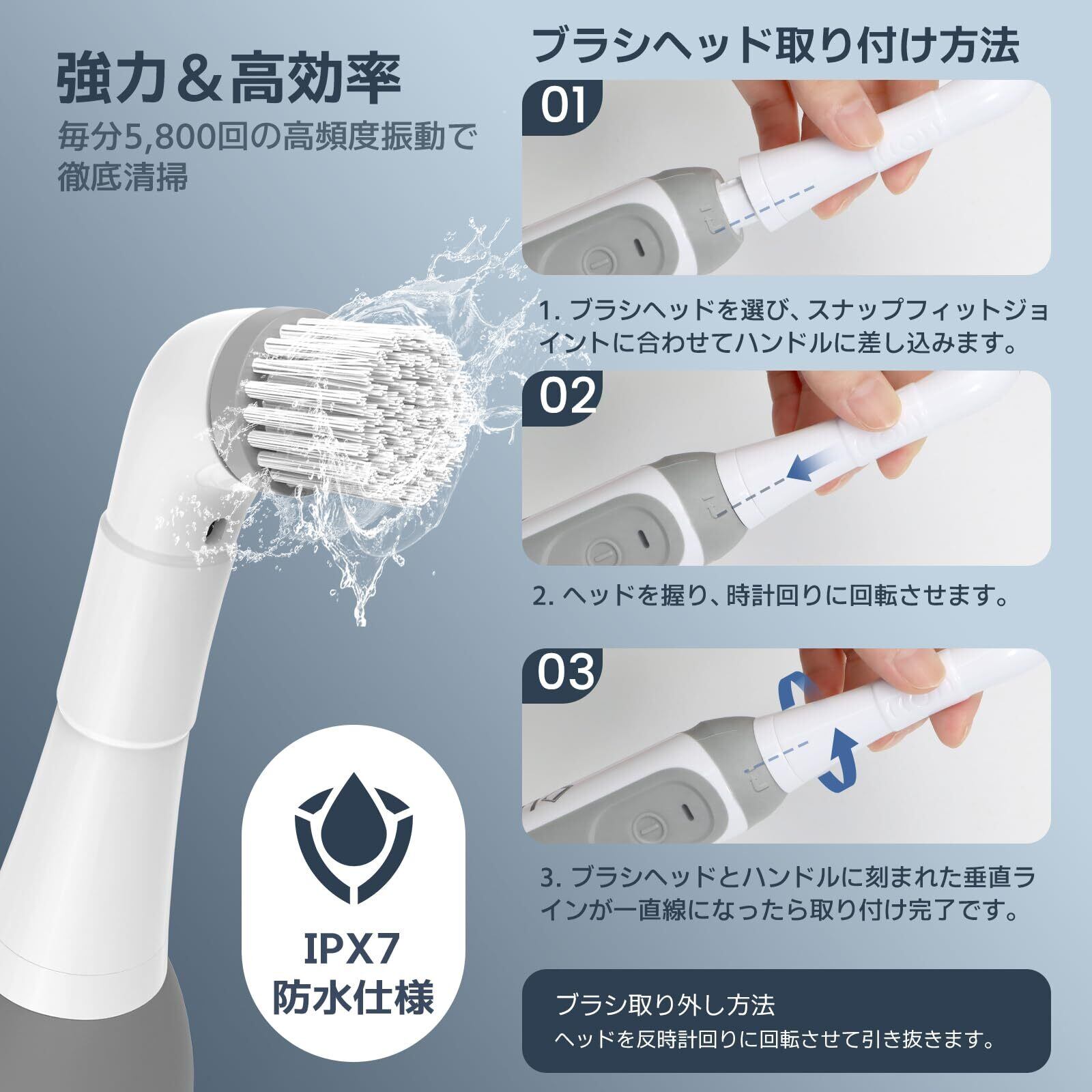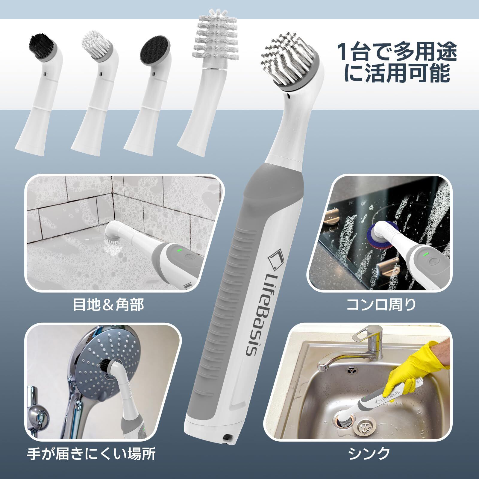 【1台5役!すみずみまでお掃除に大活躍】 ✨5種類の交換用お風呂掃除ブラシヘッド付属!キッチンの排水口や水道蛇口などの水回りから、コンロや電子レンジ、洗面ボウル、冷蔵庫の隙間までお手入れしたいところに合わせて使い分けることで、効率的にお手入れができ、お掃除がぐっと楽になります。