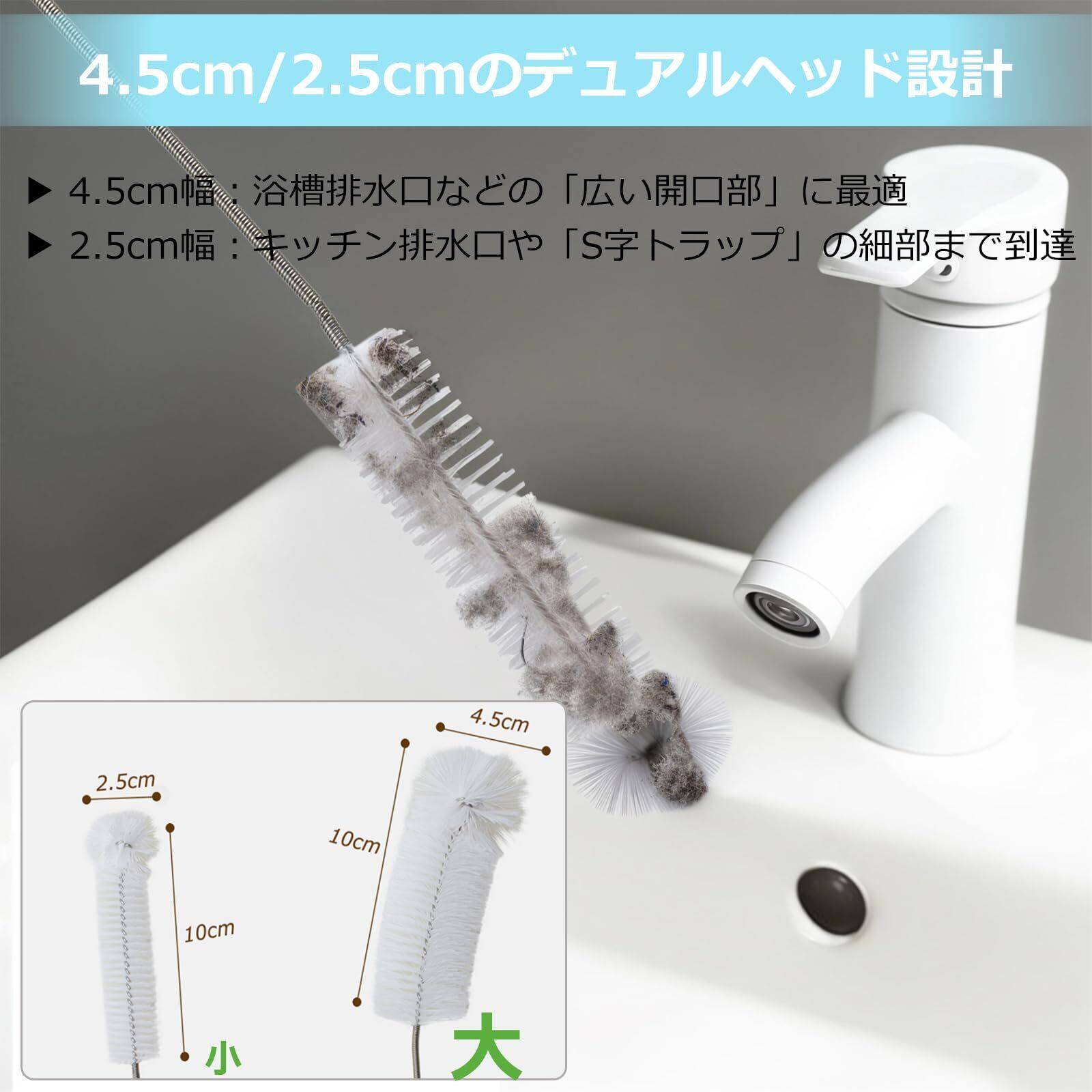 『大小両用ヘッド』 - 大きい排水口から小さい排水口まで対応できる2サイズのヘッド設計で、様々な排水口に合わせて使い分けられる実用的なクリーナー