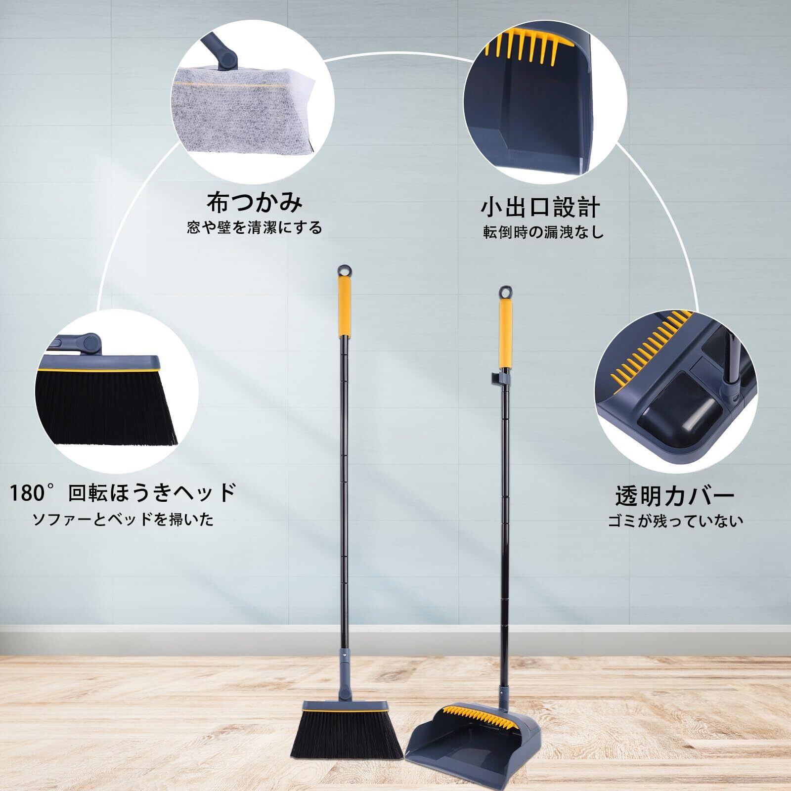 アップグレードされた機能:ほうきヘッドの2つのスナップは、窓拭き、モップ掛け、掃き掃除などの不織布と連動します。また、180度回転するヘッドで、ベッドやテーブルの下など、目隠しになる場所の掃除も簡単です。