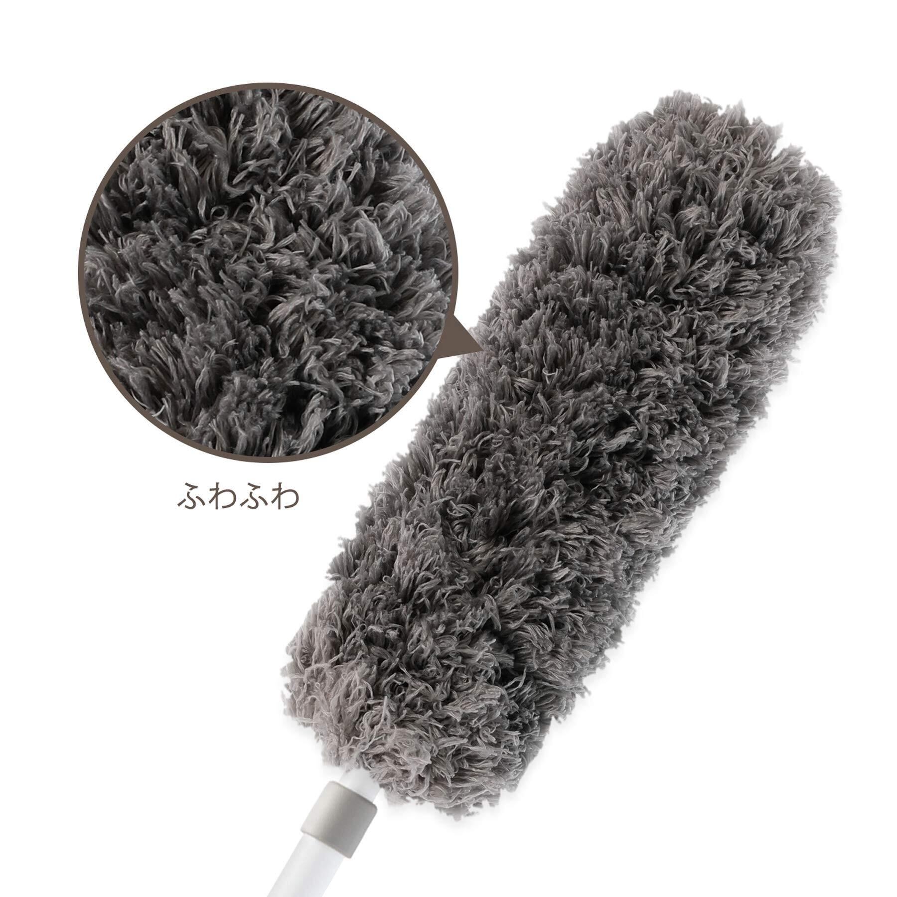 [ヘッド]:マイクロファイバー+カーボン・スチール。マイクロファイバー材質で、吸着性強くて、軽くなでるように拭いて静電気吸着できて、髪の毛、糸屑、紙くず、花粉、ハウスダストやホコリ等が一瞬にキャッチして、取り除けます。繊細且つ柔らかくて触り心地のいい素材で、床面、壁や家具等への傷止めもできます。軽量で手洗いした後に、乾燥も速いです。