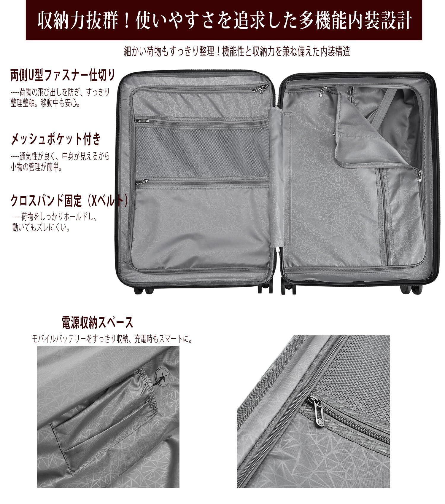 【丈夫かつ軽いPC素材、信頼のYKKファスナー採用】スーツケースの 表面素材は高耐衝撃性を持つPC(ポリカーボネート)を100%使用。高弾性で、変形しにくい。ABS素材を採用した市販品より頑丈で耐久性に優れ、ABS+PCスーツケースより軽量で持ち運びやすい。PC 素材は、現在市場で最も一般的に使用され人気のあるハードシェル ラゲッジであり、防水性、耐摩耗性、スタイリッシュさ、耐衝撃性、落下耐性を備えています。 キャリーケースは、世界的に評価されるYKK製ファスナーを使用しています。 スムーズな開閉でストレスなし 高い耐久性で長く使える 頻繁な開閉や重い荷物にも強い。ファスナーの品質がスーツケース全体の使い心地を左右します。YKKならではの安心感で、あなたの旅をより快適に。