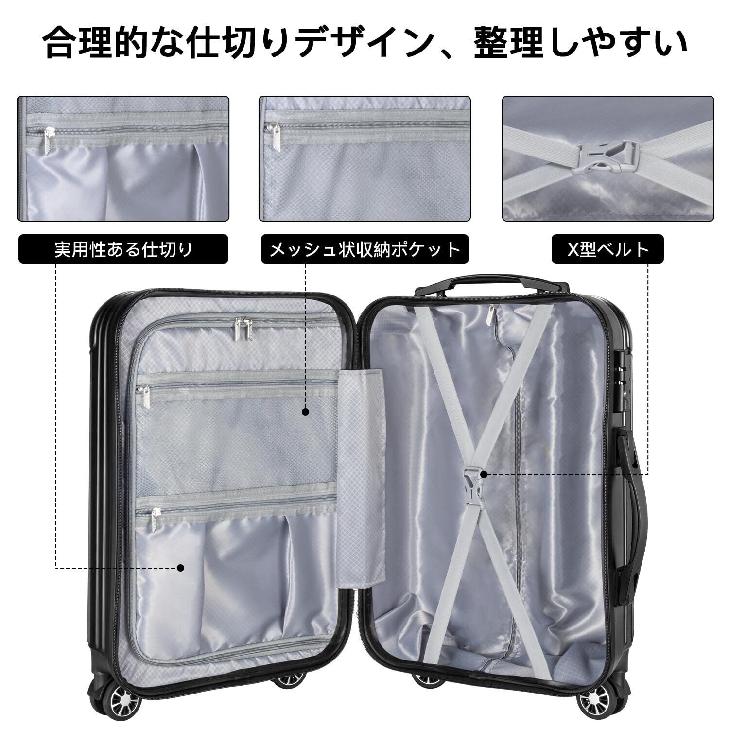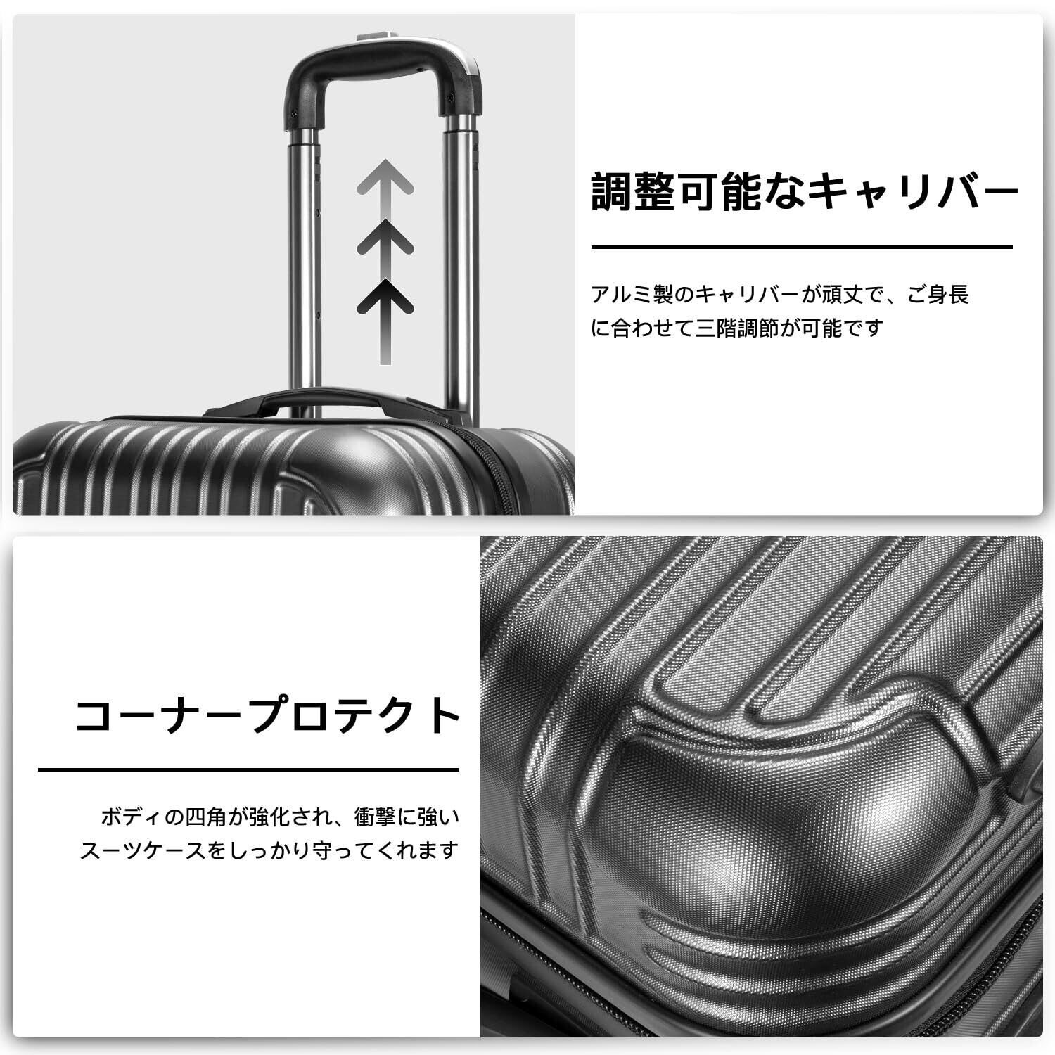 【材質&TSAダイヤル式ロック】スーツケースはABS樹脂とPCでの混合素材で作られ、耐衝撃性に優れた上、高弾性で、変形しにくい。エンボス加工、傷つきにくい。アルミフレームスーツケースより軽量で持ち歩きやすい。TSAダイヤル式ロックが搭載されて、外出がより安全。また、鍵穴は航空会社検査専用の物です。本製品に鍵は付属しておりません。