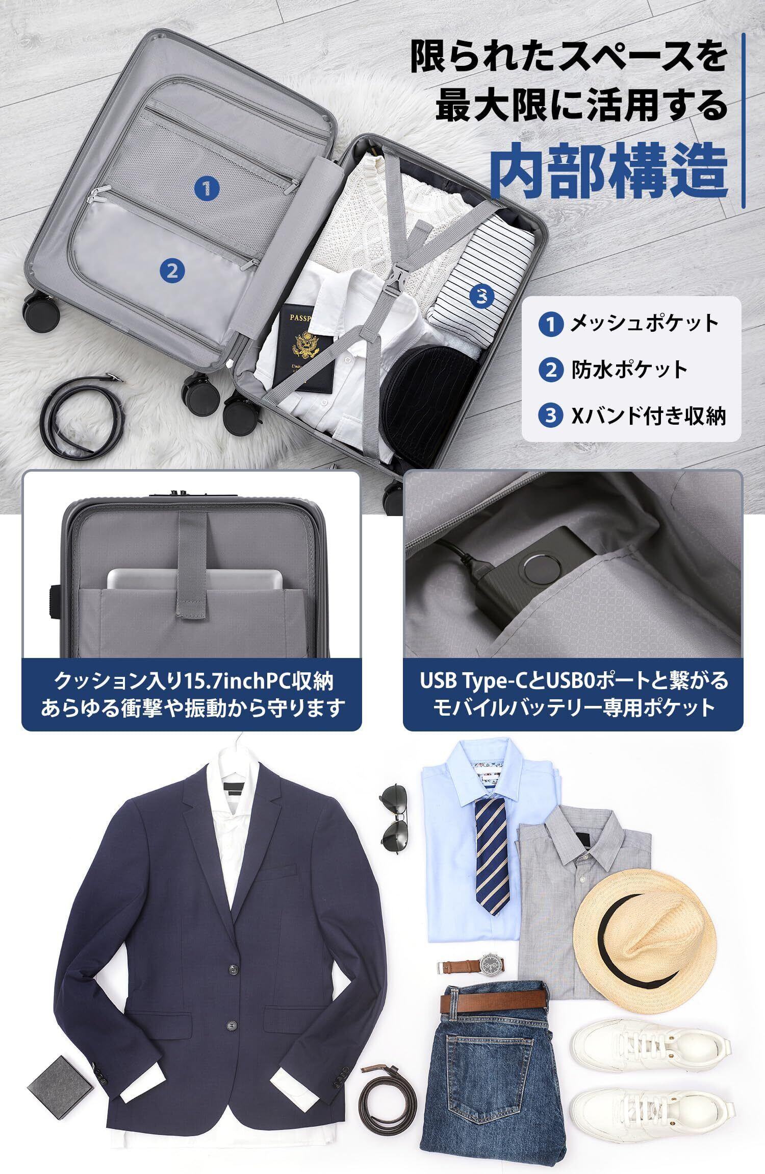 【スーツケース 機内持ち込み・フロントオープンデザイン】フロントオープンのデザインで。タブレット、書籍、携帯電話、チケットなど、荷物に合わせた細かなポケットを用意しており、フロントポケット内の荷物の仕分けもラクラク。また,出張や資料の持ち運びなどビジネス用途から旅行まで、色々な場面で活躍できます。人気が高い前開きのキャリーケースです。
