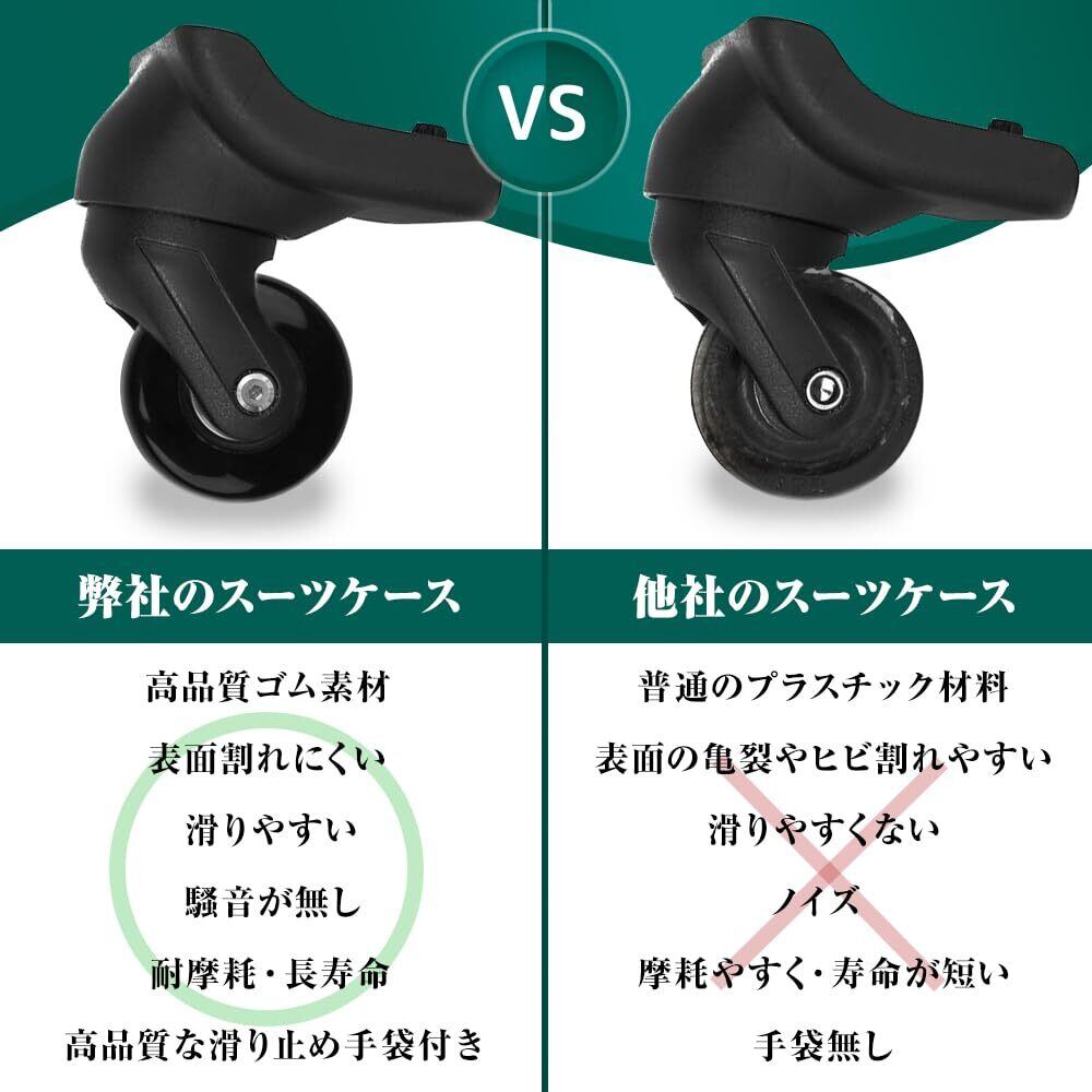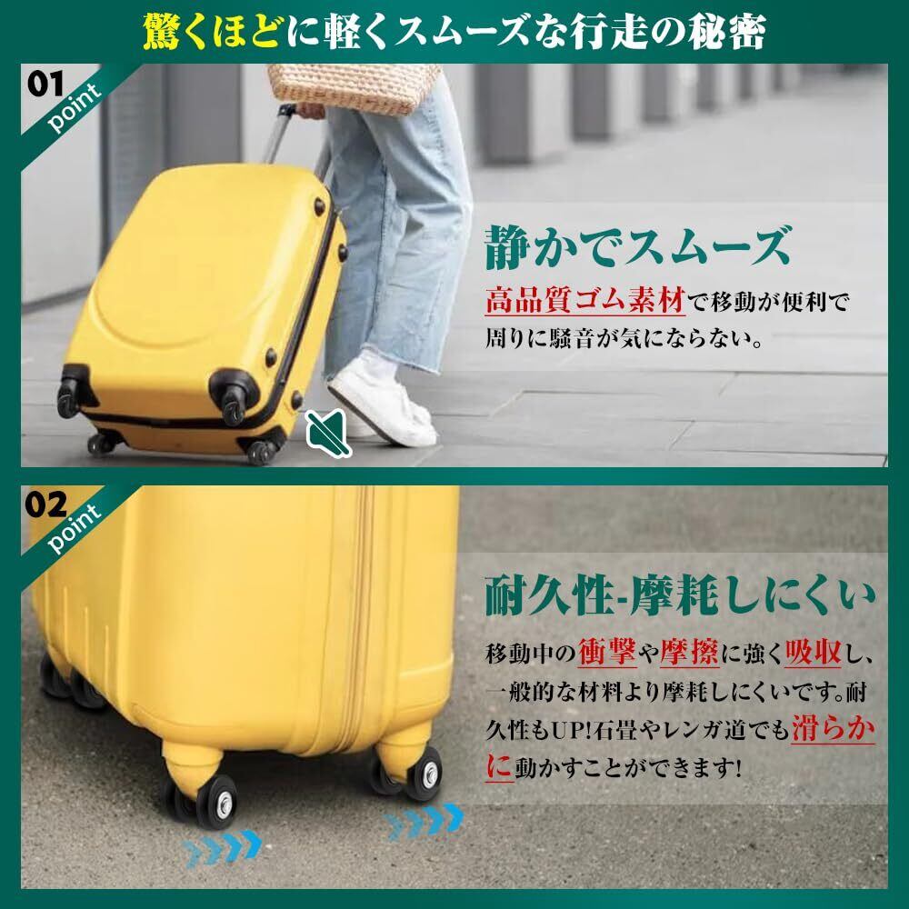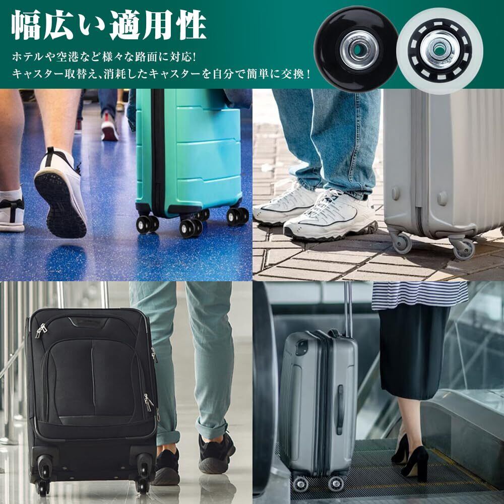 【静音タイプ-衝撃や振動の吸収】高品質のPUゴムの外輪材料で、耐磨耗性も優れ、衝撃や振動を吸収し、非常に静かに走ることができます。スーツケース キャスターはテンレス製ベアリングを内蔵しているので、各車輪は50キロの耐荷重があり、路面が荒れていても、スムーズに走行することができます。