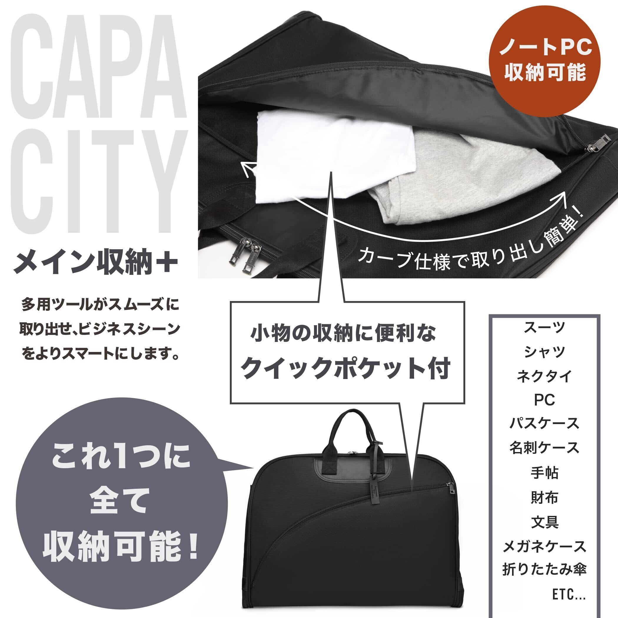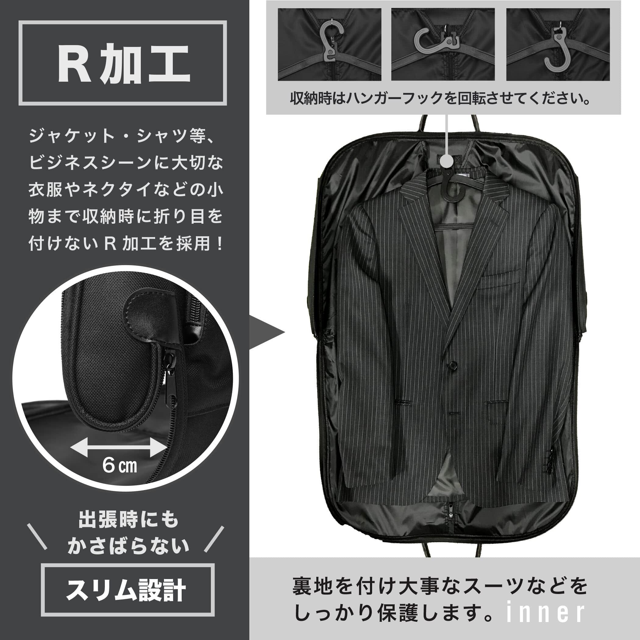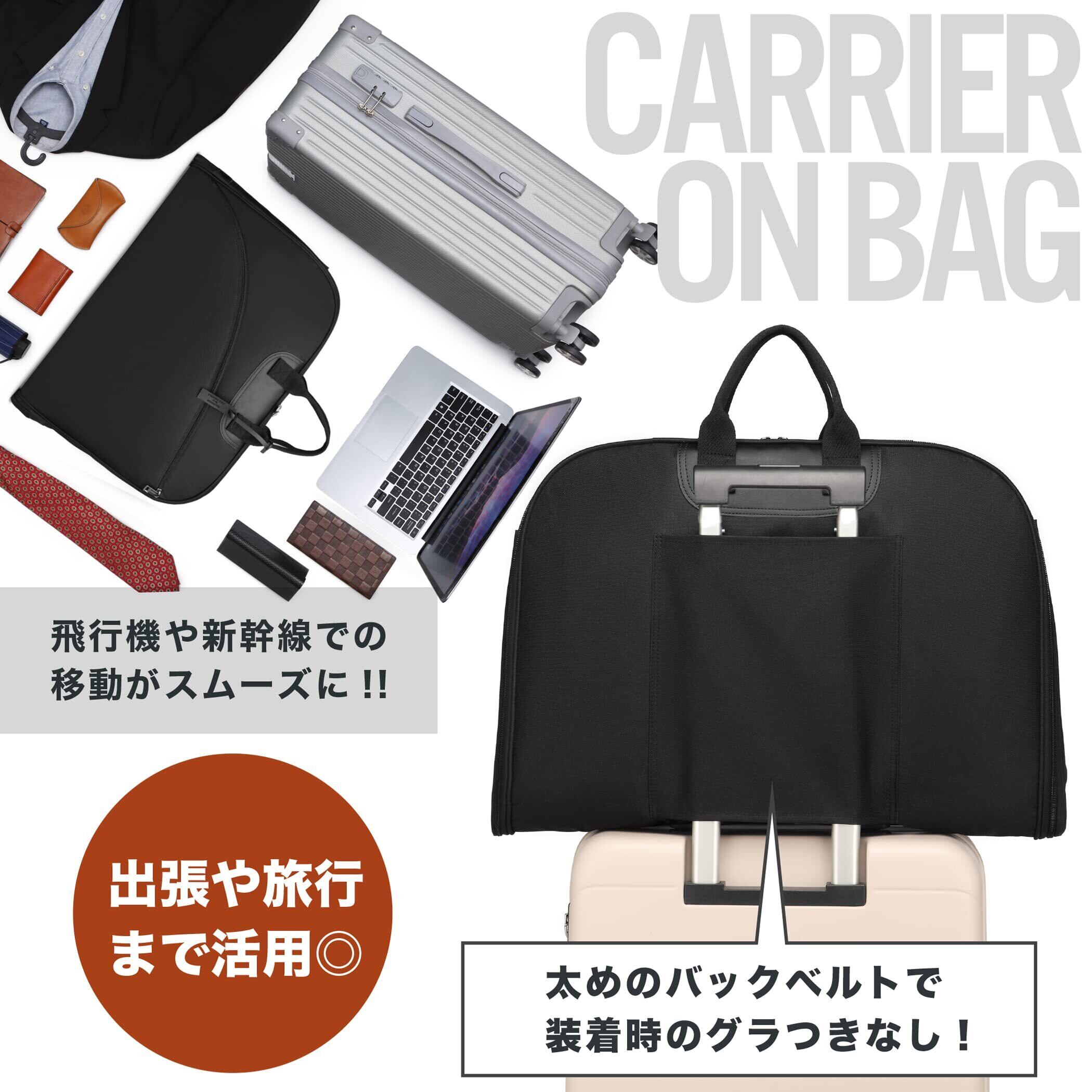 シンプルで洗練されたガーメントバッグです。①収納する衣服に折り目をつけにくいように『R加工』を採用。②スーツだけでなく、ネクタイや財布、名刺ケースなどのアクセサリー、パソコンも収納できる大容量。③キャリーケースに装着可能。太めのバックベルトで、装着時のぐらつきも抑えます。④サイズ感も大きすぎず、持ち運びやすいです。
