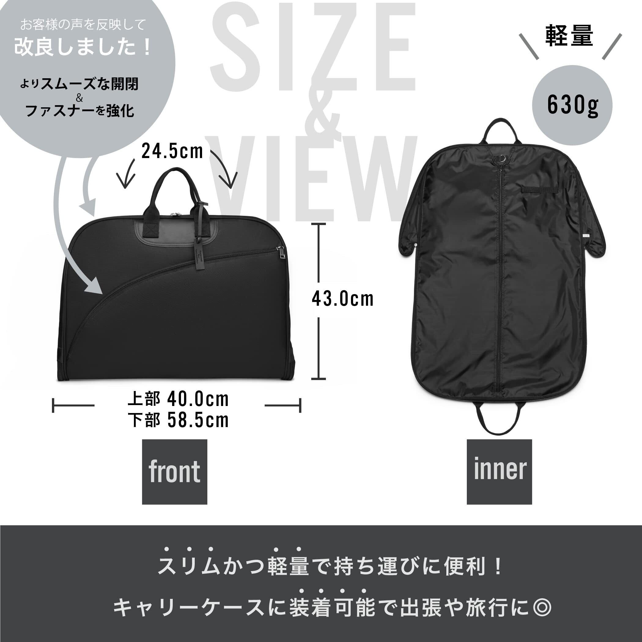 【商品改良改善】お客様のお声を反映し ファスナーを変更しスムーズな開閉とファスナー部分の強化を行いました。 裏地を付け大事なスーツなどをしっかり保護します。 PUハンドルを厚みのある棉生地テープに変更したことにより、さらに持ちやすくなりました。