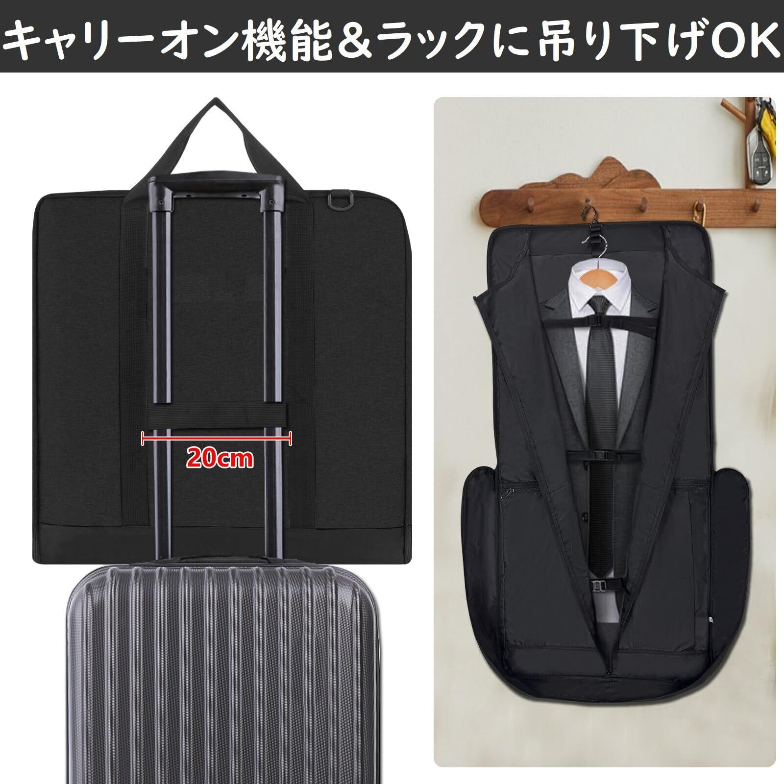 【スーツ一式を3着までまとめて収納】ビジネスマンであればキレイなスーツを着るのが常識。只、簡易なガーメントバッグだと持ち運びの際にシワが付いてしまうことも。この悩みを解決するのがこのガーメントバッグ。持ち運ぶ際にスーツがズレてシワにならないよう考えられた設計。スーツ、シャツ、ネクタイ、ベルト、靴下、ハンカチなど、出張時に必要なものをまとめて収納できるガーメントバッグ。スーツはハンガーに掛けたまま収納できるのでシワにならずに持ち運べます。それに、アップグレードしたデザインはスーツ3着をまとめて収納可能、スーツやドレスなどを収納できる最大の収納容量を提供します。