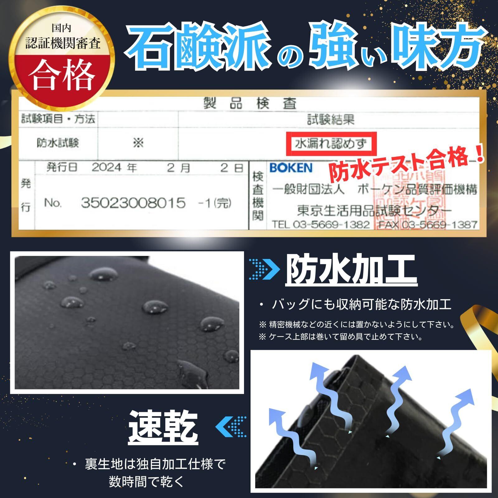 【国内認証機関試験合格】防水生地で作られているため、ケースに水が掛かっても内部に浸透することがありません。