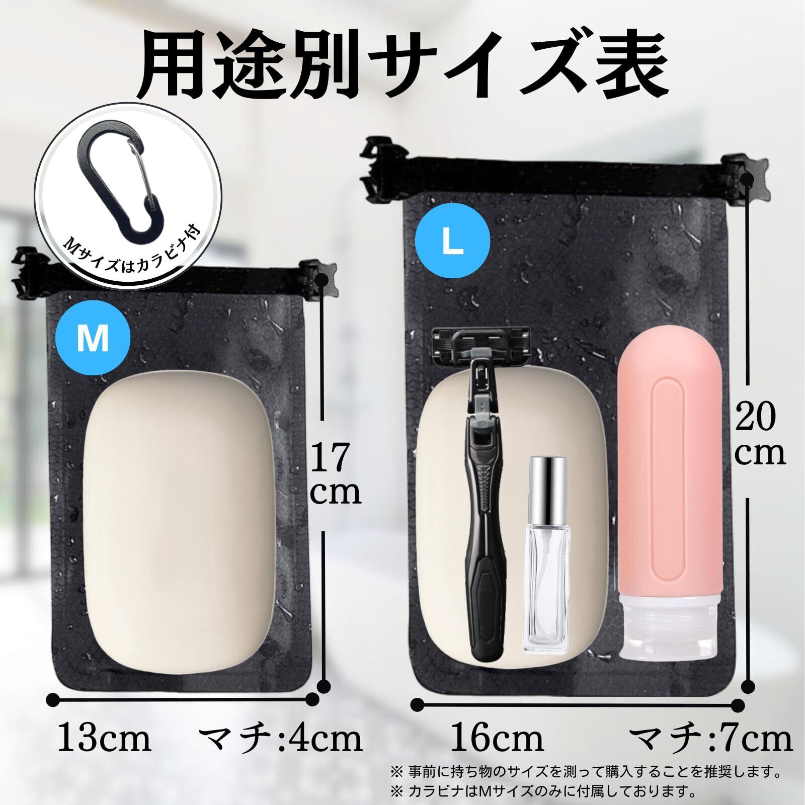 【選べるサイズ展開】国内で販売されている一般的な石鹸サイズはMサイズに収まります。カミソリやアトマイザなど周辺アイテムも収納したい場合はLサイズをご利用下さい。