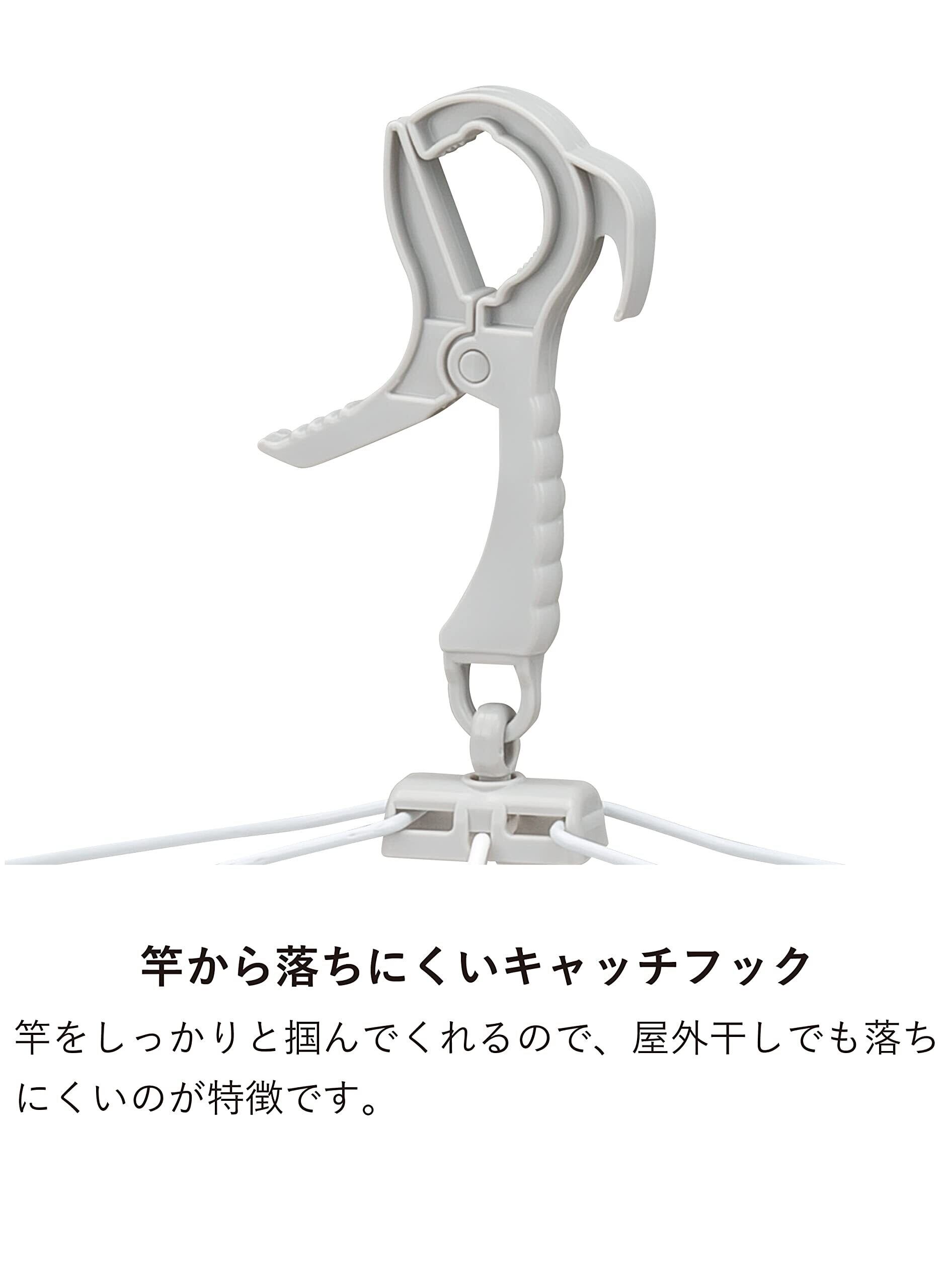 屋外干しでも安心な、しっかり竿をつかむキャッチ式フック。フレーム部分とフック部分を6か所で固定しているのでフレームが歪みにくい。