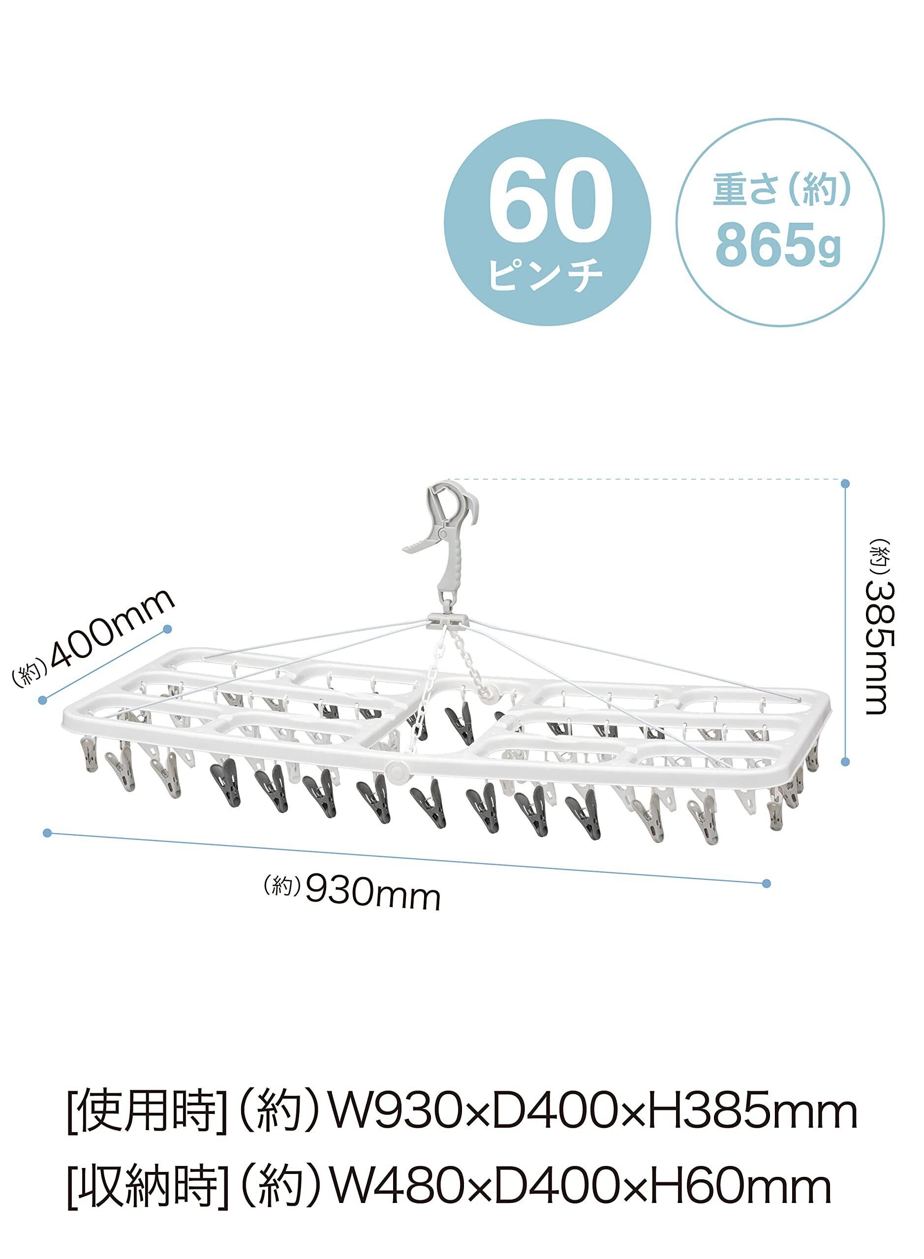 ボトムスから靴下などの小物まで、まとめて干すのに便利な「ランドリーハンガー60ピンチ」干し方を工夫して内側に下着などを隠して干すことができます。