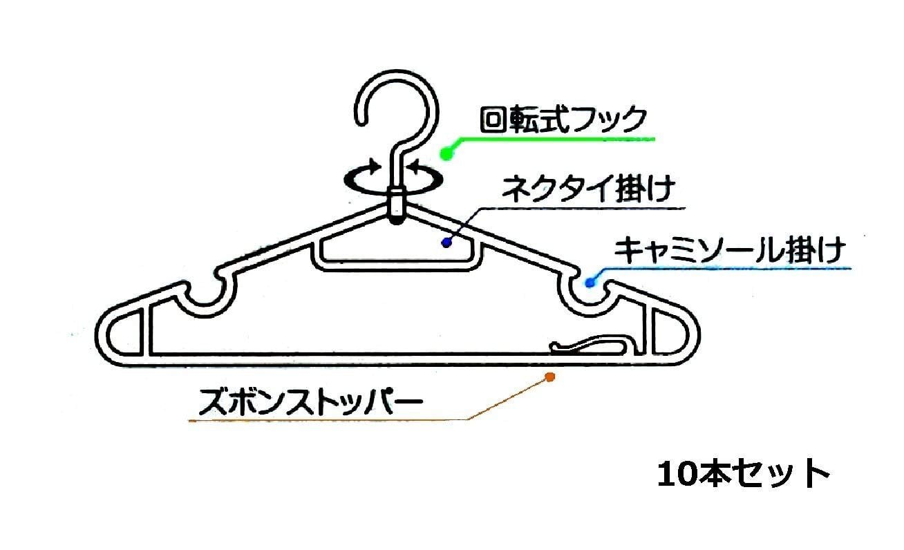 フックが回転する首振りタイプだから鴨居やカーテンレールにも掛けられる ネクタイ・スカーフ掛け付き キャミソール・タンクトップ等の肩ひも掛け付きスラックスストッパー付き お買い得10本セット