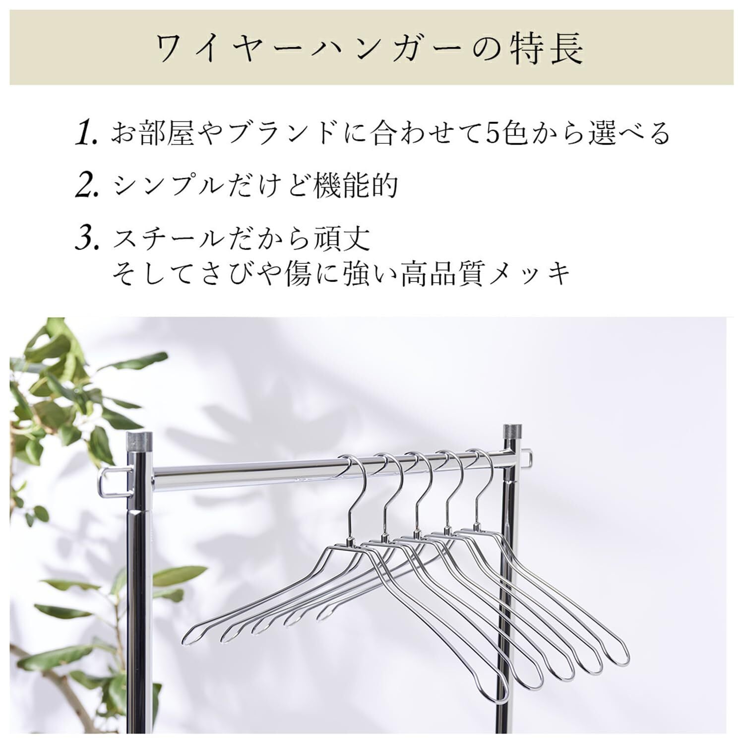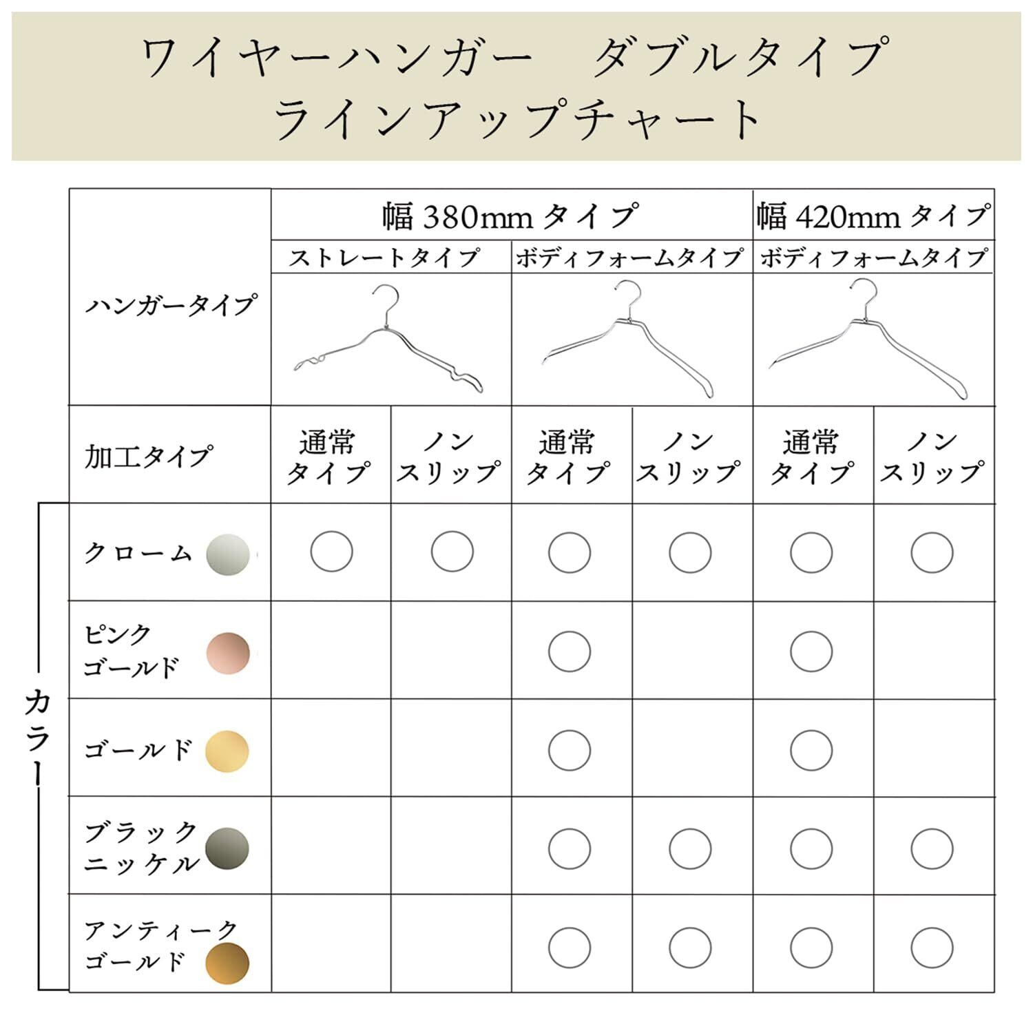 フックは便利な360度回転。 ダブルのワイヤーは肩口の厚みでジャケットなどの型崩れを防ぎます。