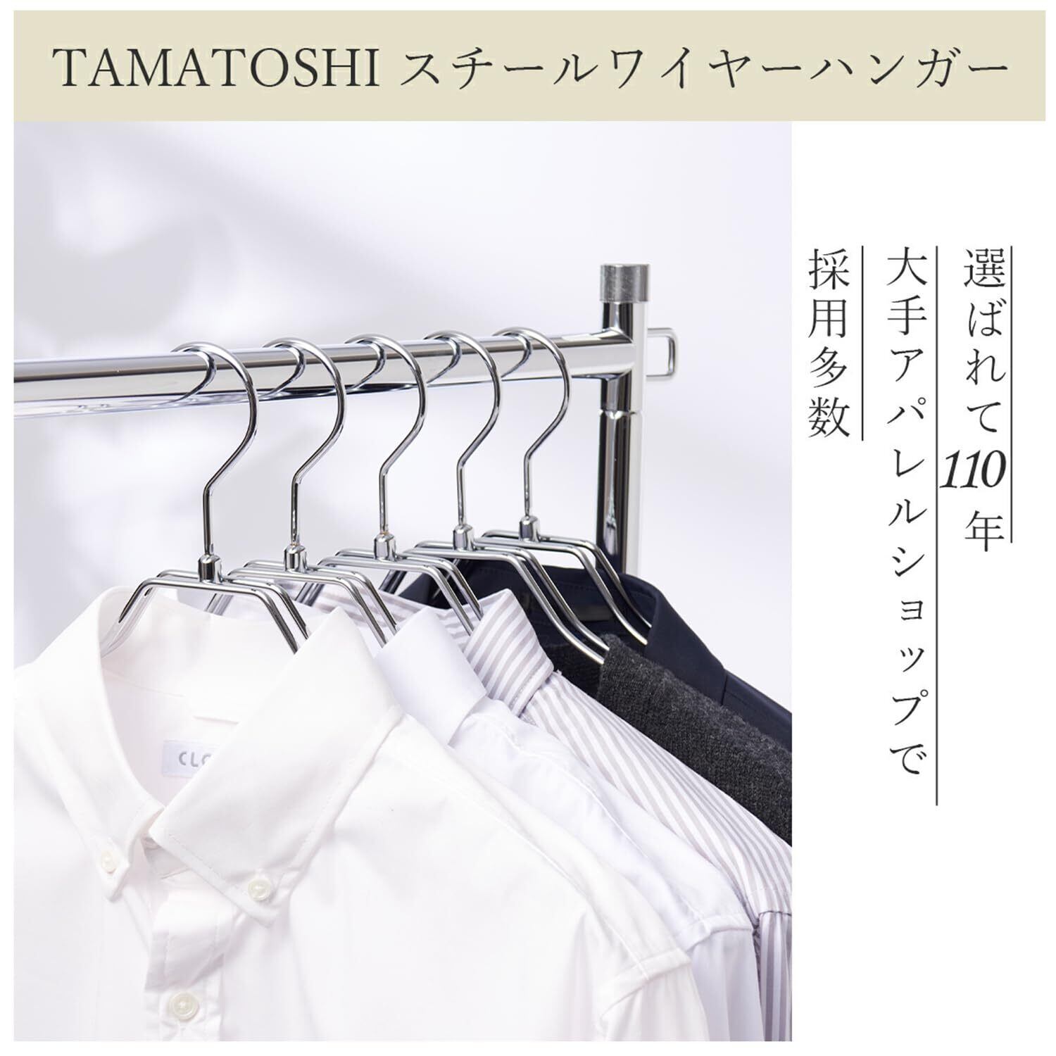 フックは便利な360度回転。 ダブルのワイヤーは肩口の厚みでジャケットなどの型崩れを防ぎます。