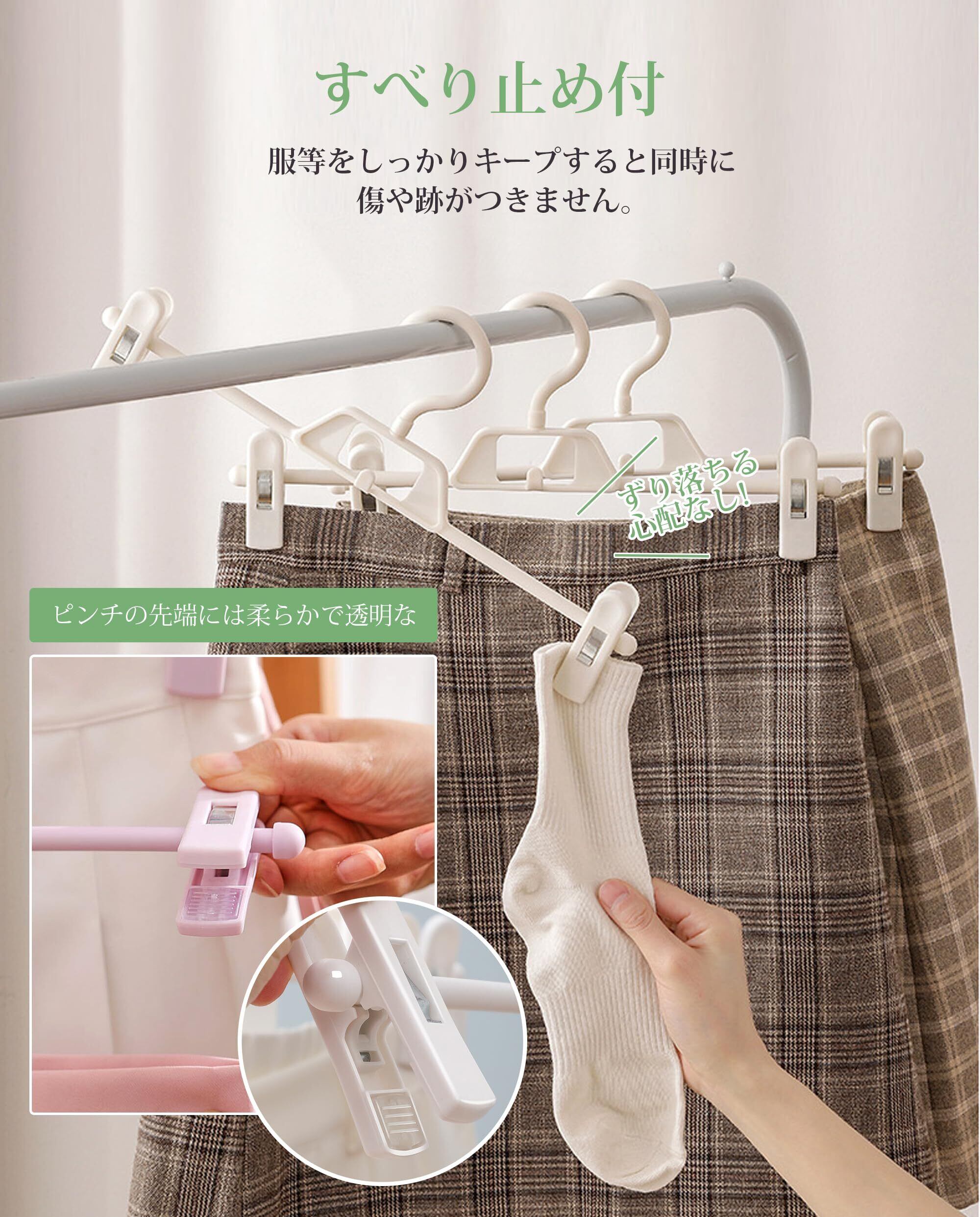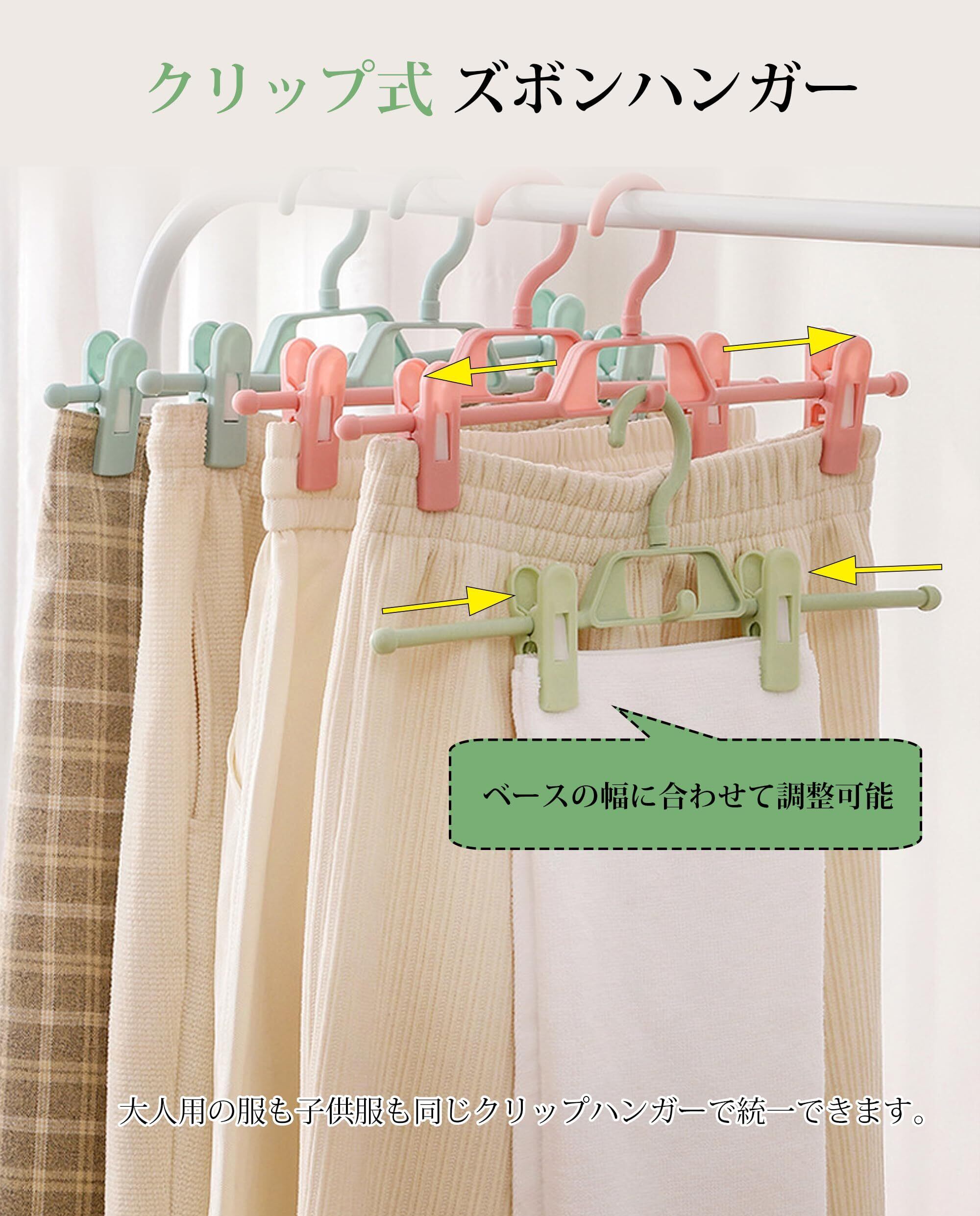 【調整可能&すべらない】洋服のサイズに合わせてクリップの幅を変えられるため、、さまざまな大きさの衣類をかけられます。男性のズボン・スカート・子ども服など、幅広い衣類に対応できます。クリップ部分には滑りにくいプラスチック素材を使用しています。デニムやコーデュロイ、スラックスなど、様々な素材のズボンでも、しっかりとグリップします。