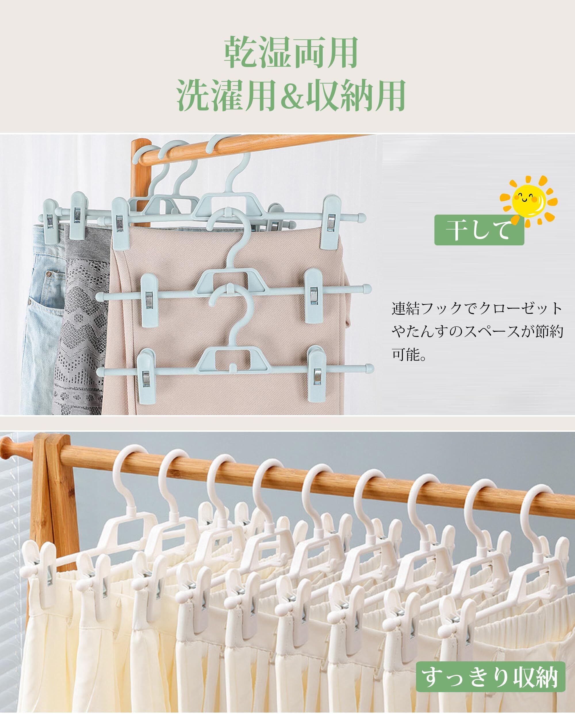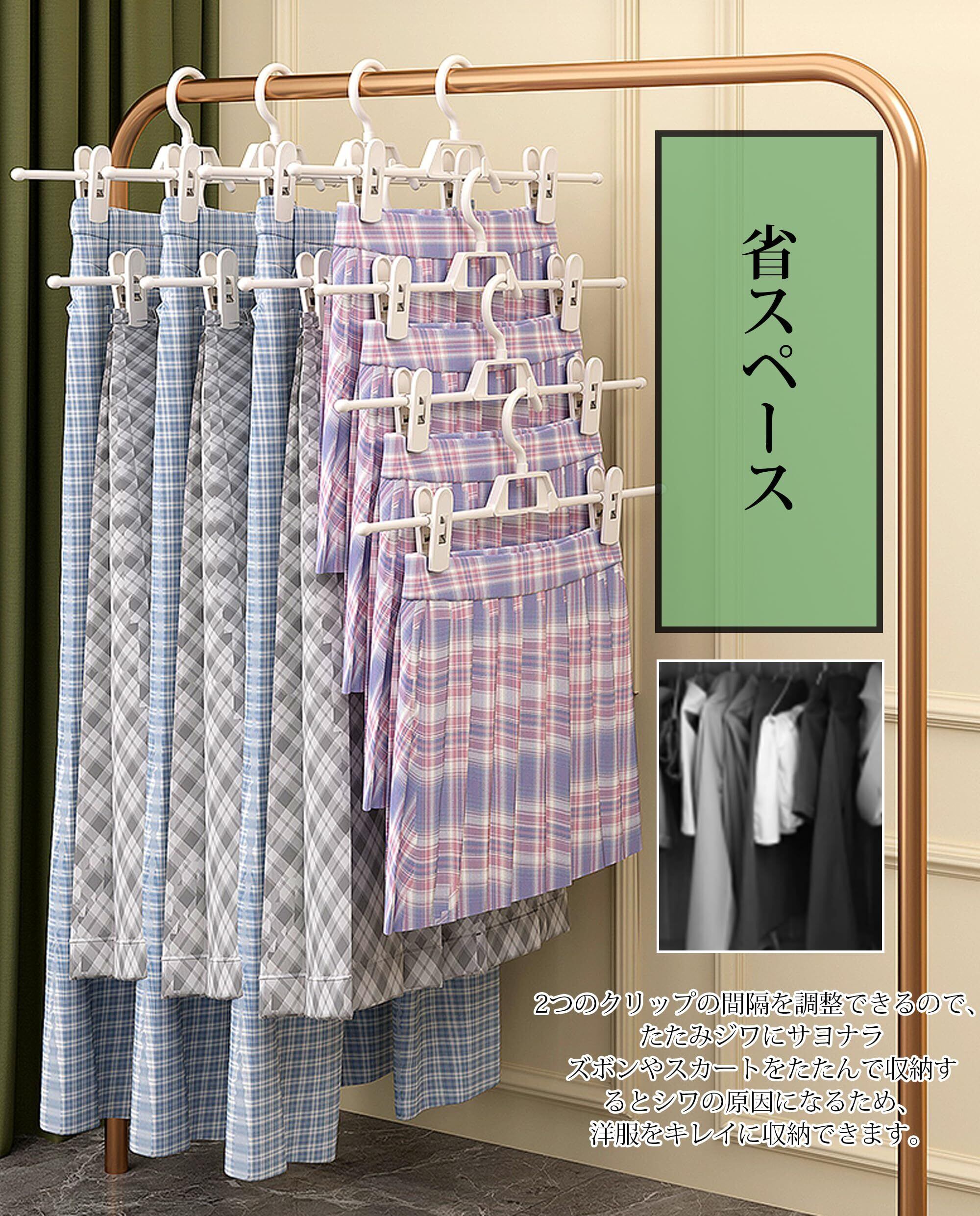 【省スペース】多段・連結フックがあり、クローゼットが狭い家庭でも省スペースでたくさんのアイテムを収納できます。ゴチャつきがちなクローゼットもすっきりします。収納スペースを最大限に活用することができます。様々なスカート、ズボンに適するだけではなく、マフラーやスカーフ、水着やインナー小物類にも適しています。