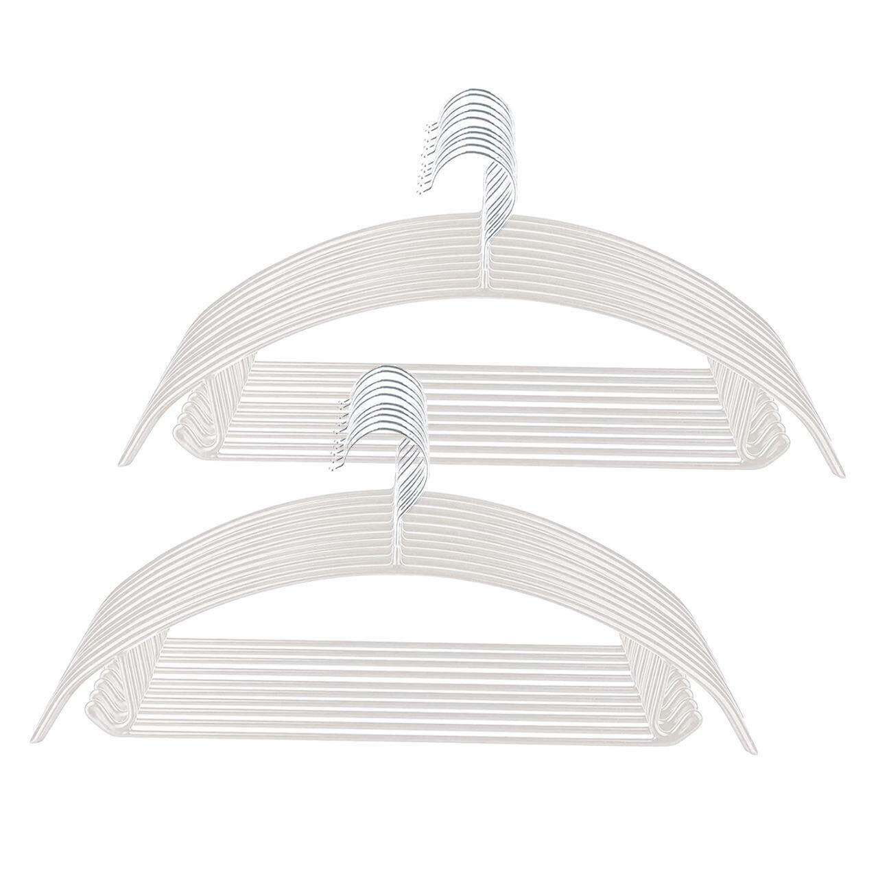 【服がすべらず型崩れしにくい】ハンガー全体に特殊PVC加工が施されているため、どんな素材の服でも滑りにくくなっています。また、半円のデザインになっているため一般的な三角形のハンガーに見られる角がなく、洋服が型崩れしにくくなっています。一方で、一般的な半円デザインのハンガーとは異なり、下部分にも直線部分と両端にフックがついているので、ズボンや下着、キャミソール、スカート等幅広く活用いただけます。