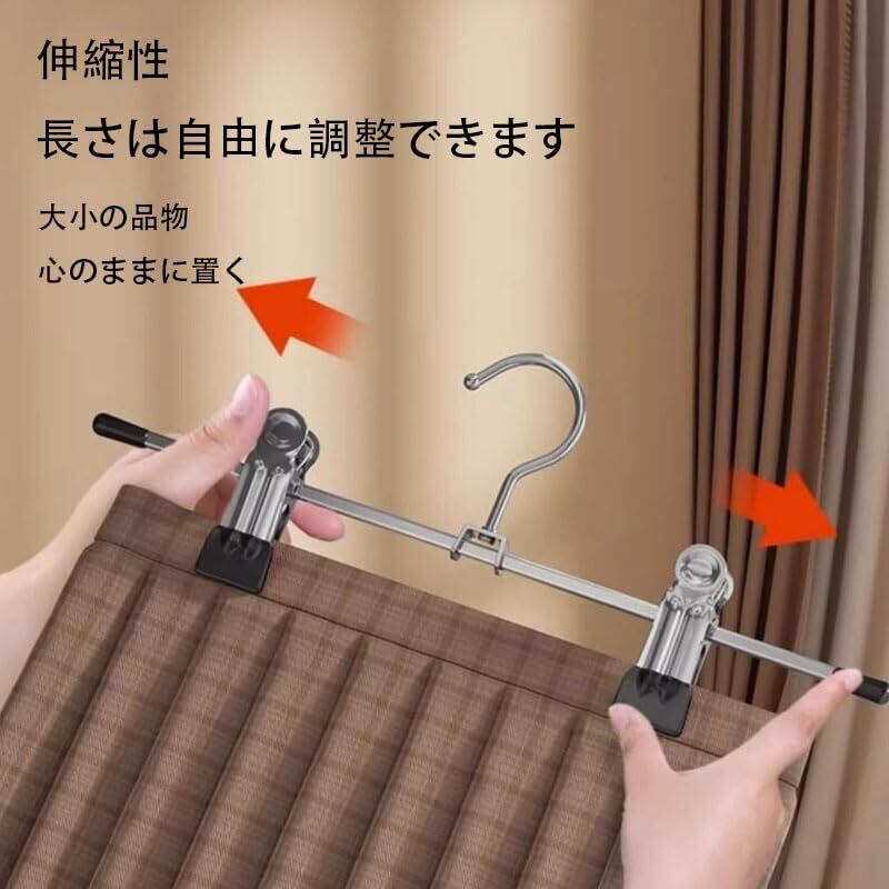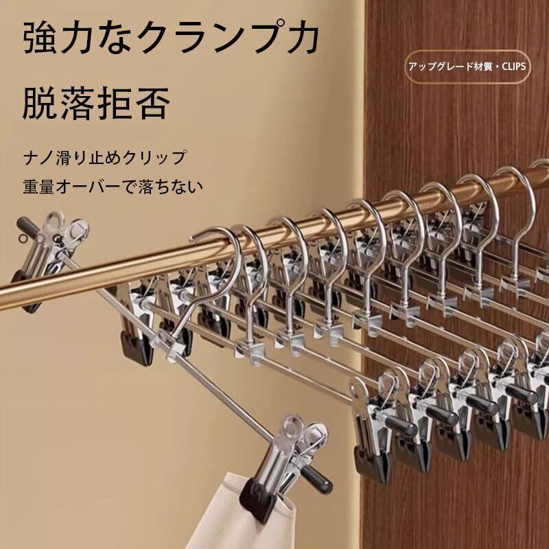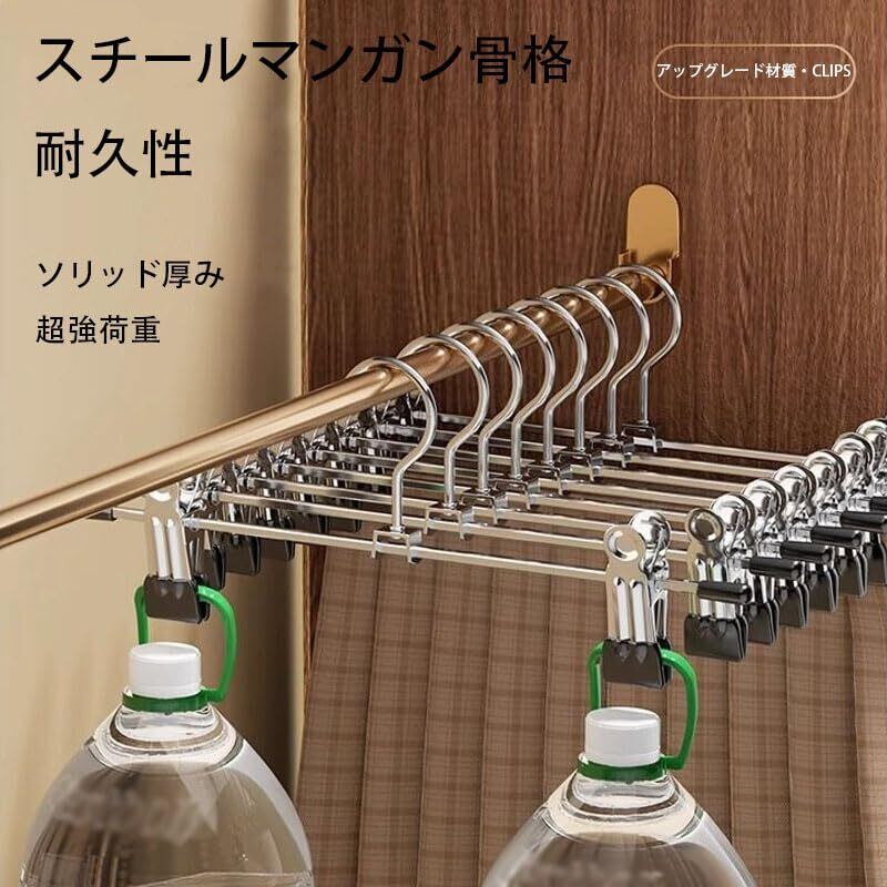 【耐久性の高いハンガー】パンツハンガー本体は金属素材を採用し、耐久性が高く、長持ちします。ハンガーはメッキ加工が施されているので錆びにくく、シンプルなデザインでクローゼットの衣類を綺麗に整理できます。