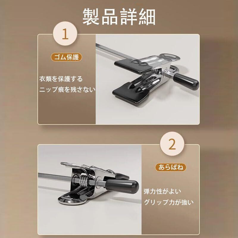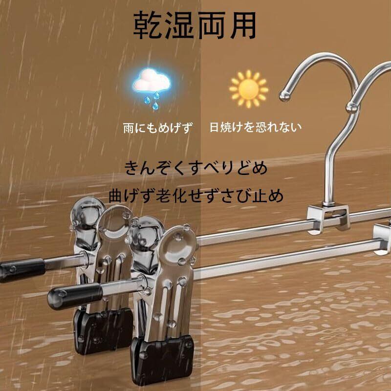 【滑り止め設計】強力なクリップで服をしっかりと挟み、滑る心配がありません。パンツやスカートなどだけでなく、水着やタオル、雑巾にもぴったりです。