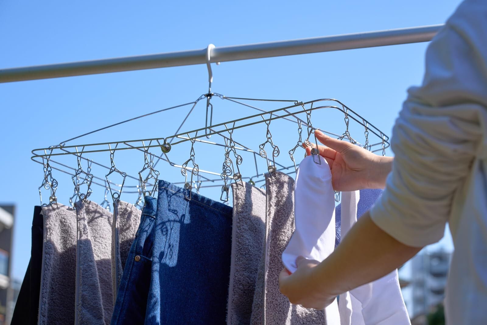 商品の高さを調整し全長を短くしており、マンションのベランダにて高さ制限があっても対応できるように変更し、便利な持ち手もある