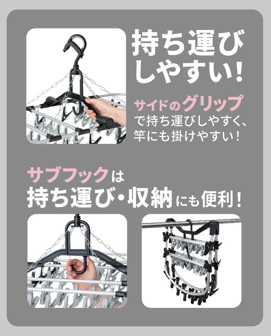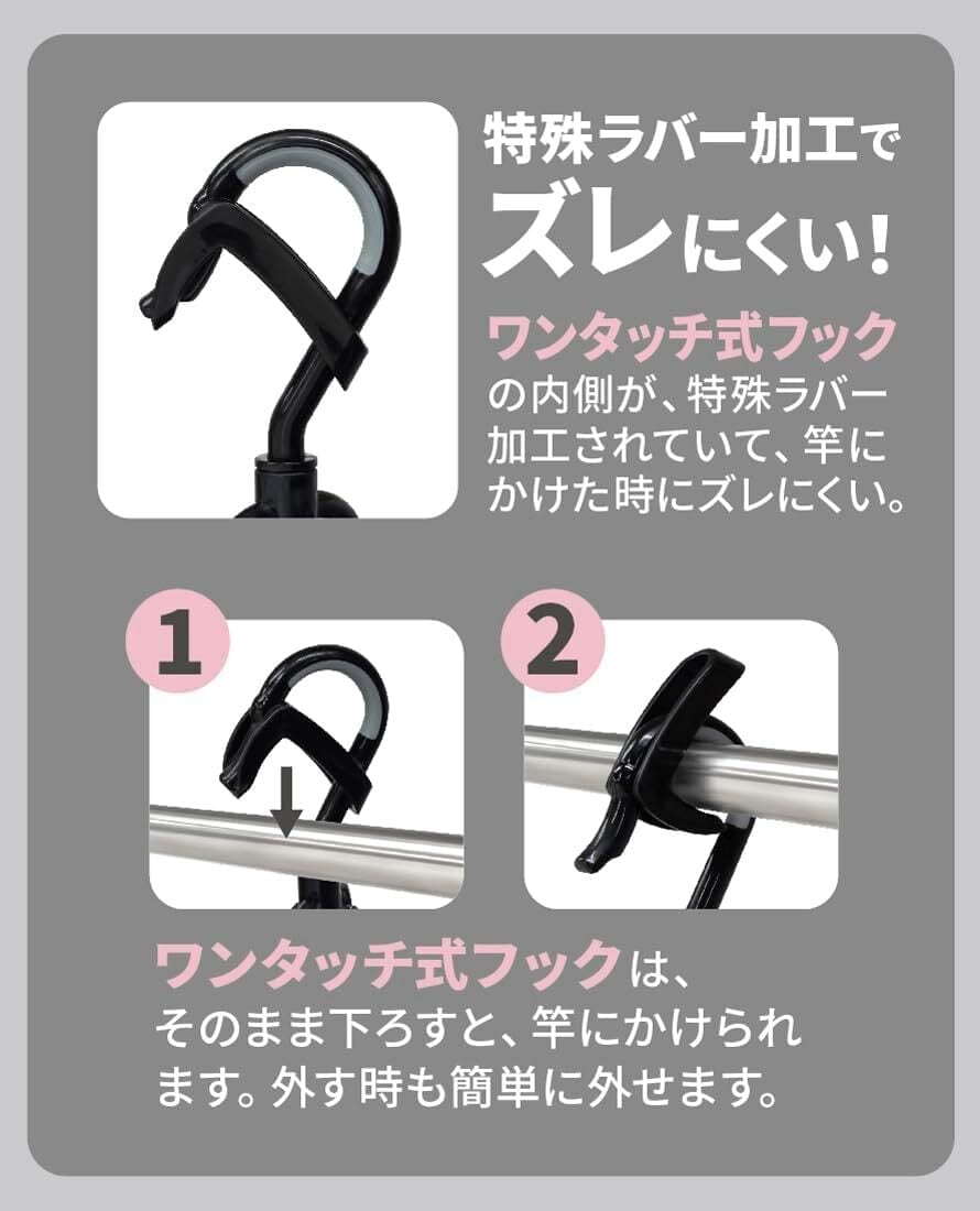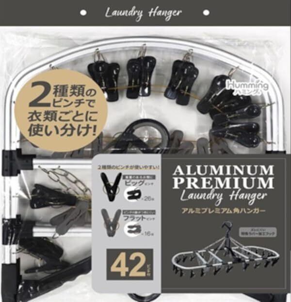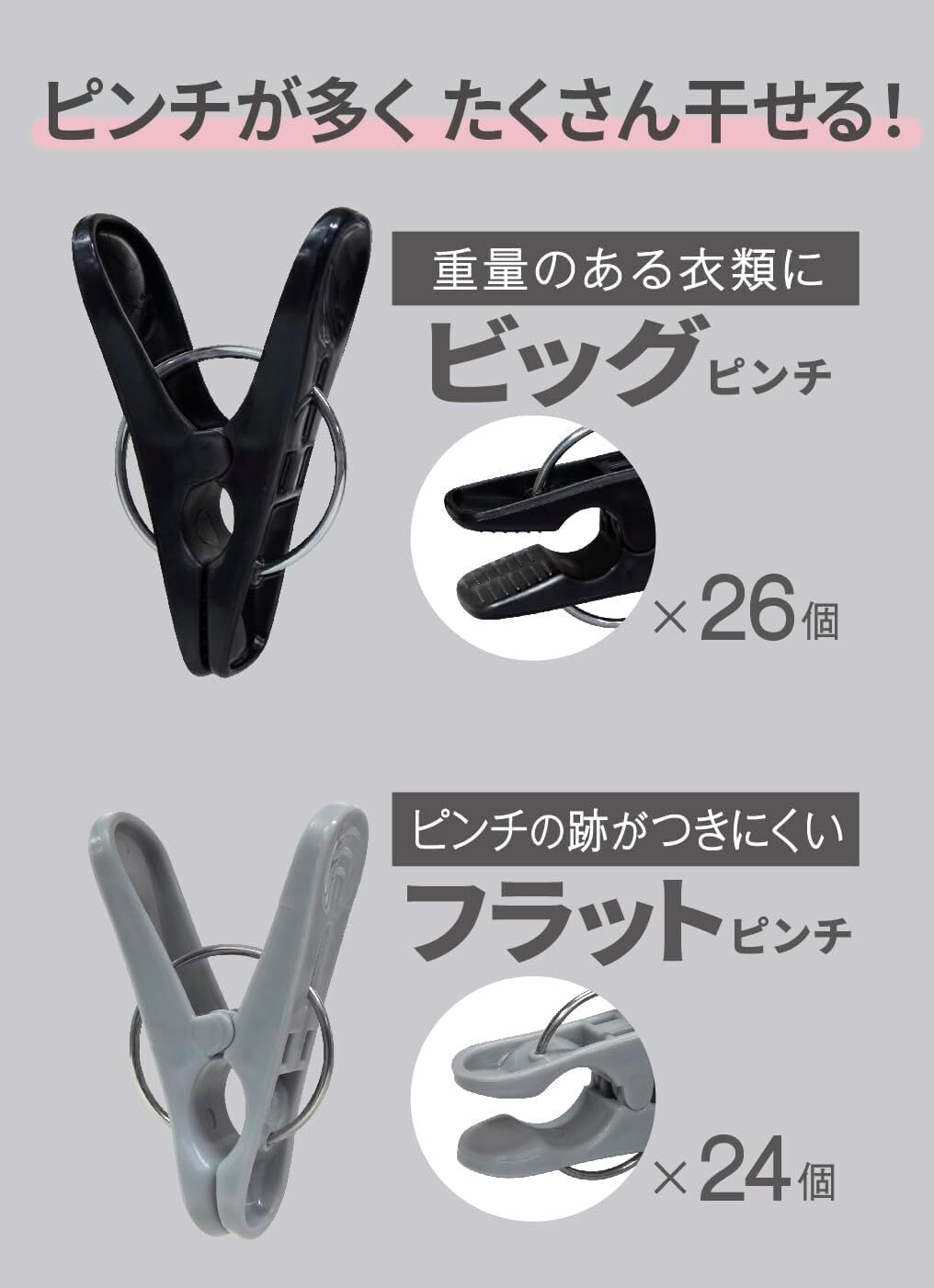 干しやすさを追求して2種類のピンチで計50ピンチを採用した角ハンガー