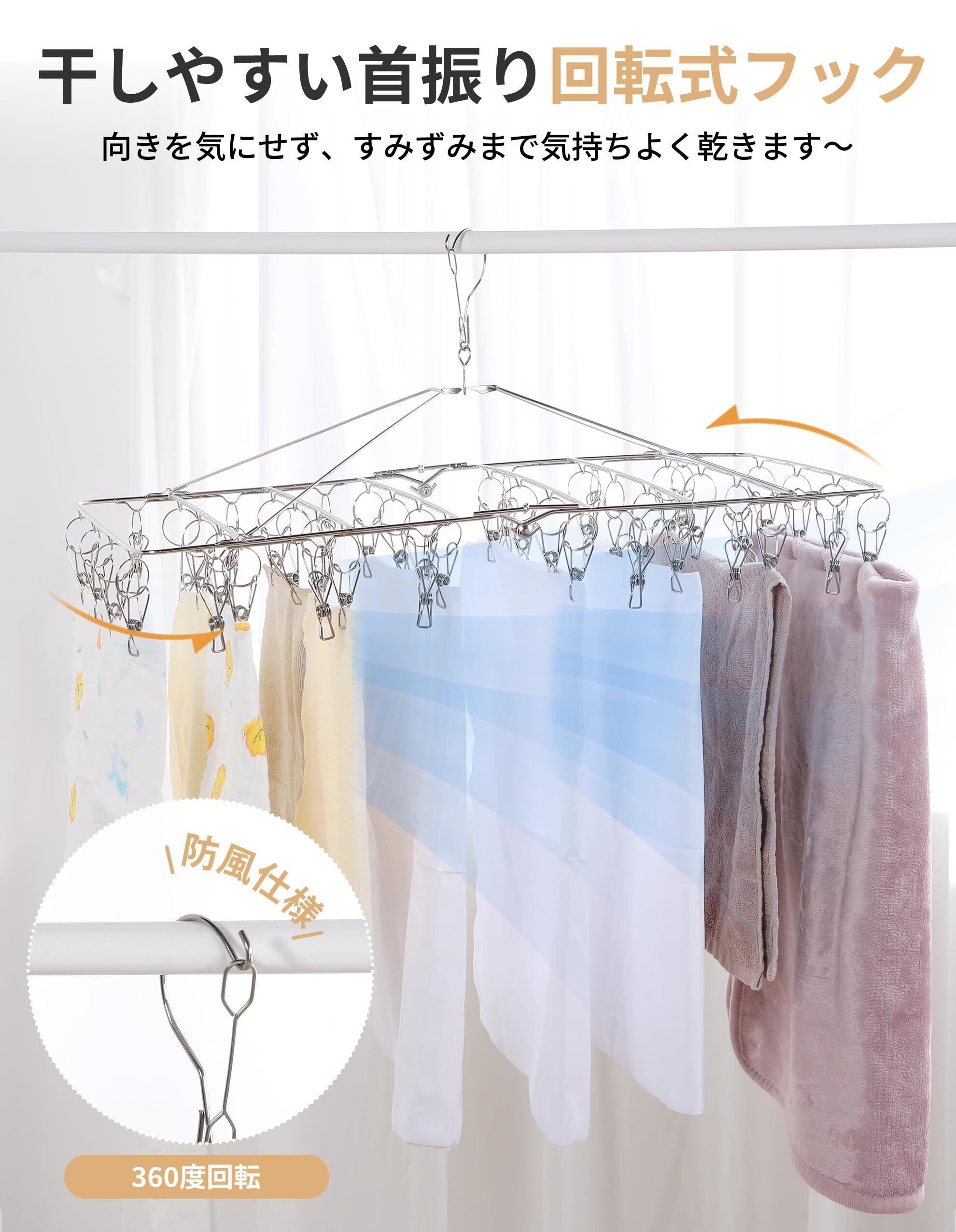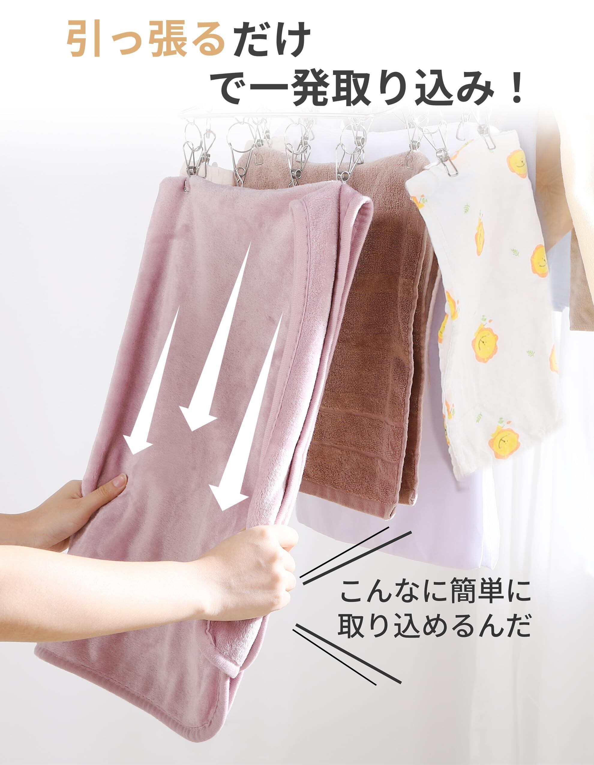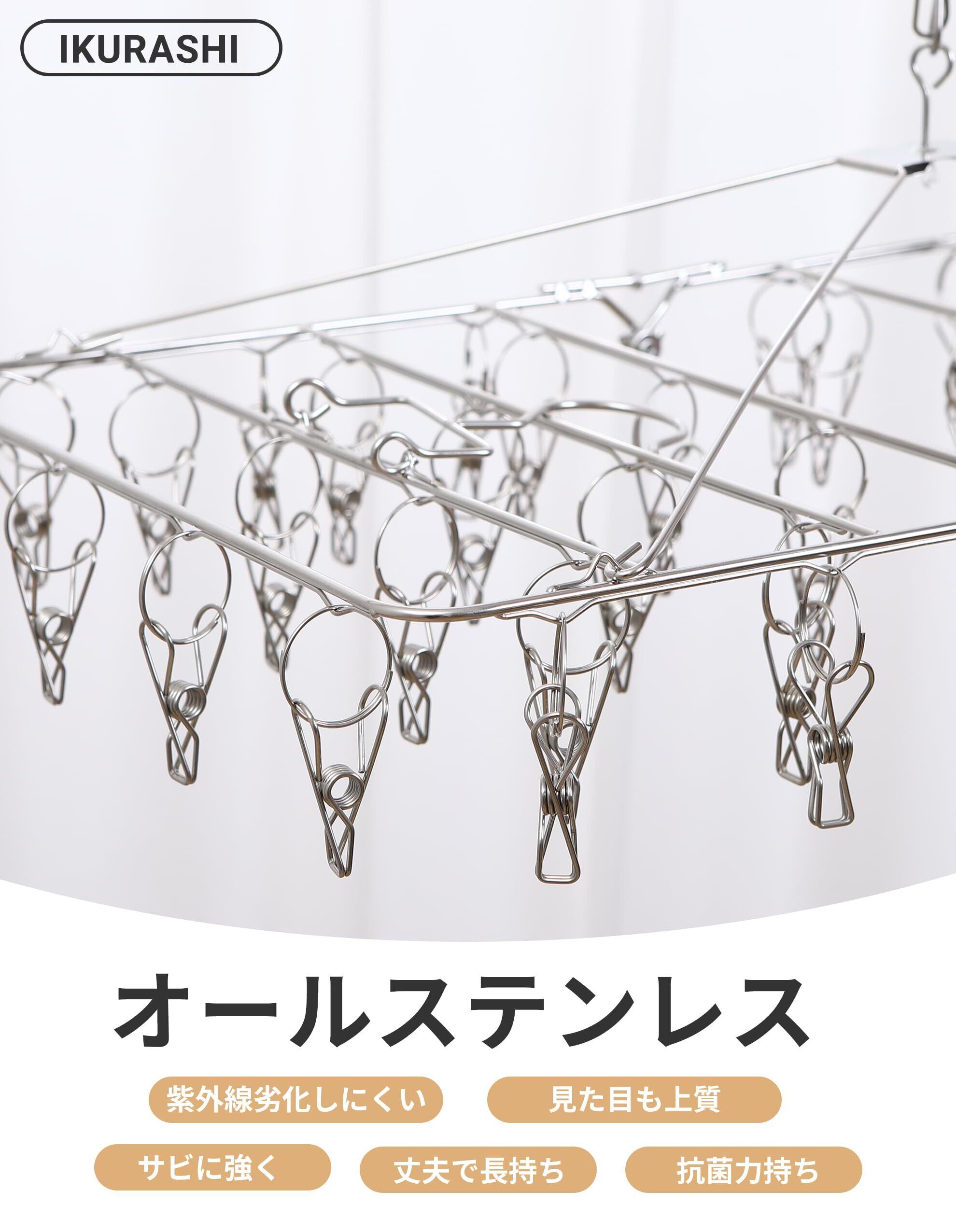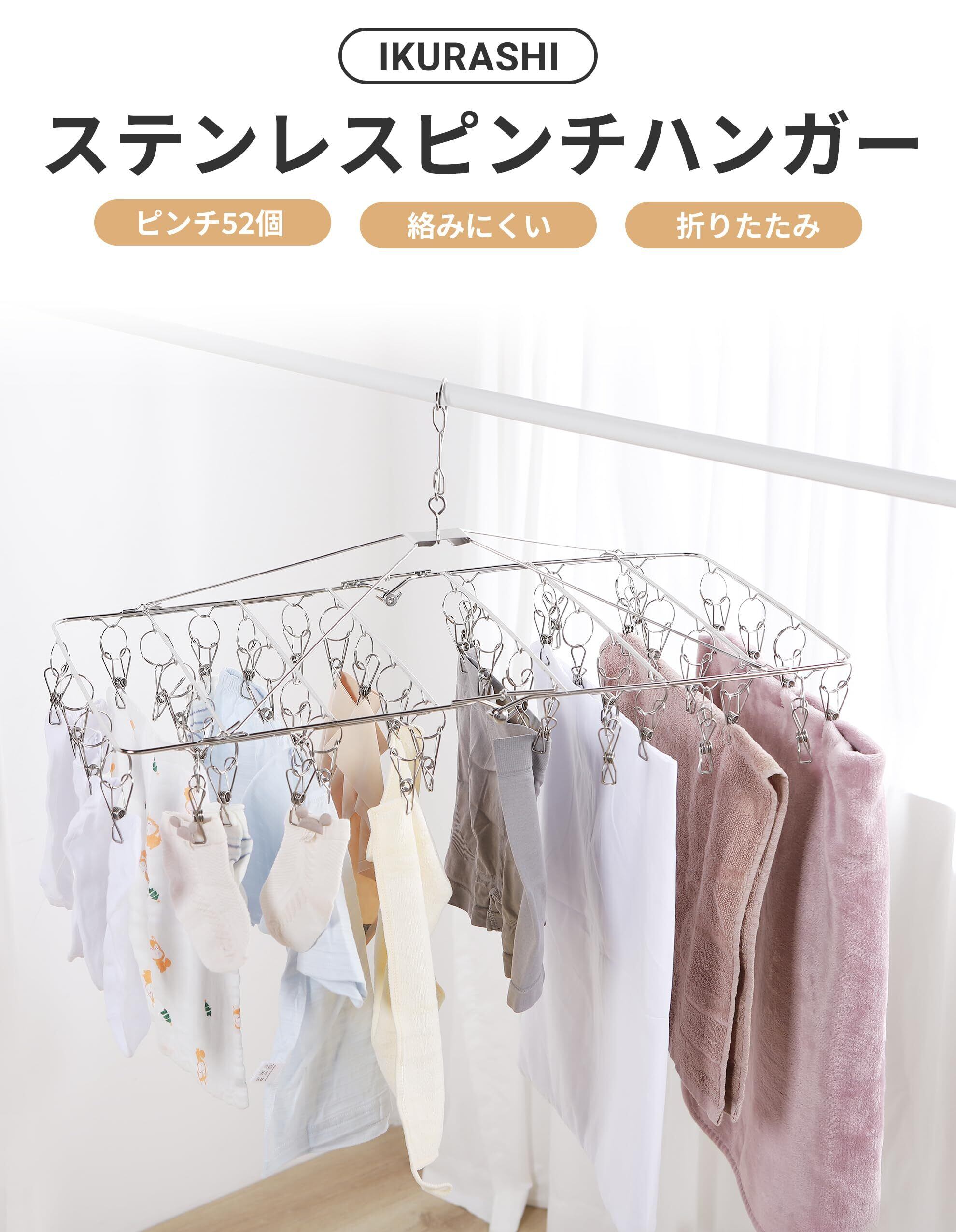 【 限定】アイクラシ(Ikurashi) ピンチハンガー 52ピンチ 角ハンガー 引っ張るだけ ステンレス 洗濯ハンガー 洗濯ピンチ 洗濯 大きい タオル(15個予備ピンチ付)