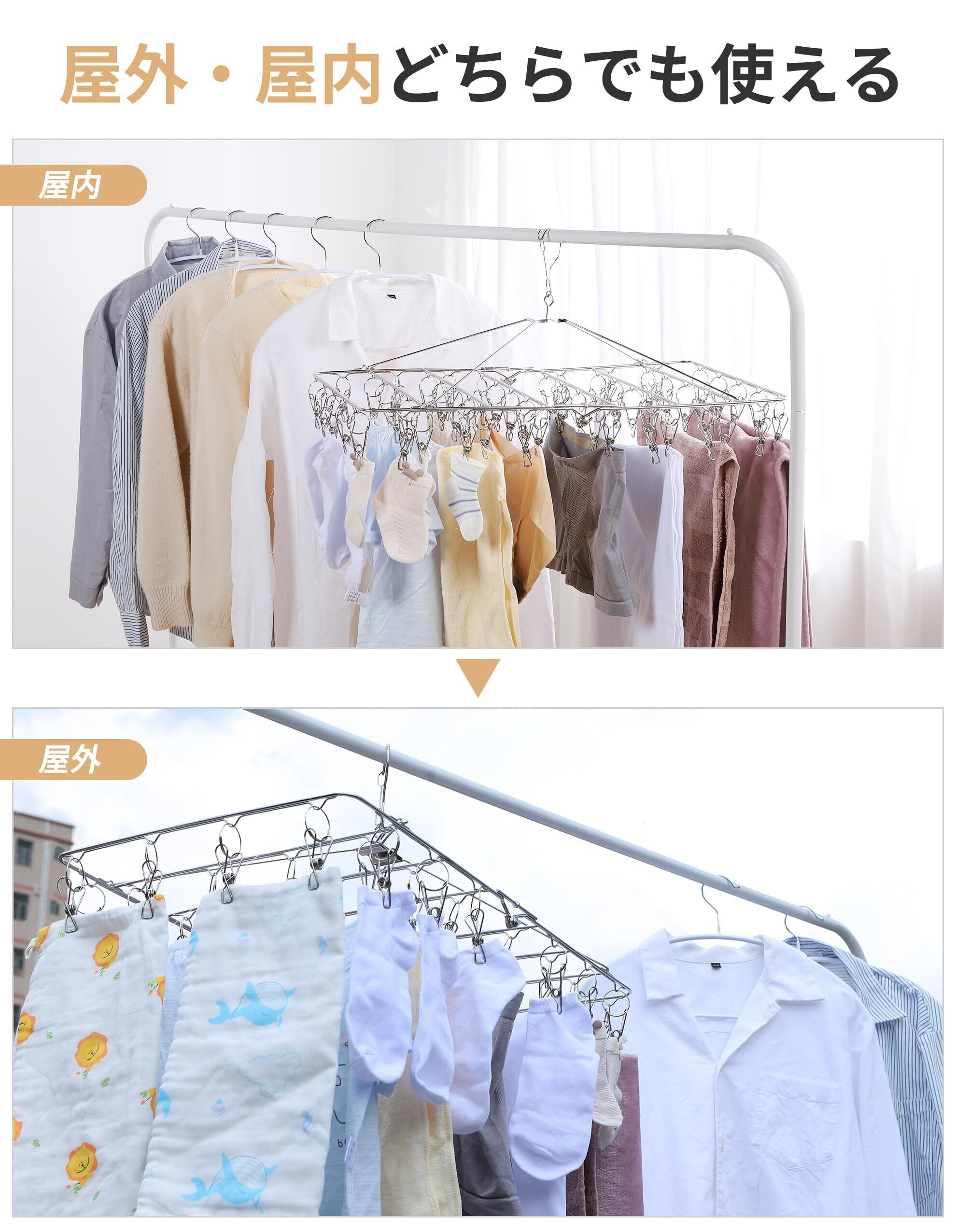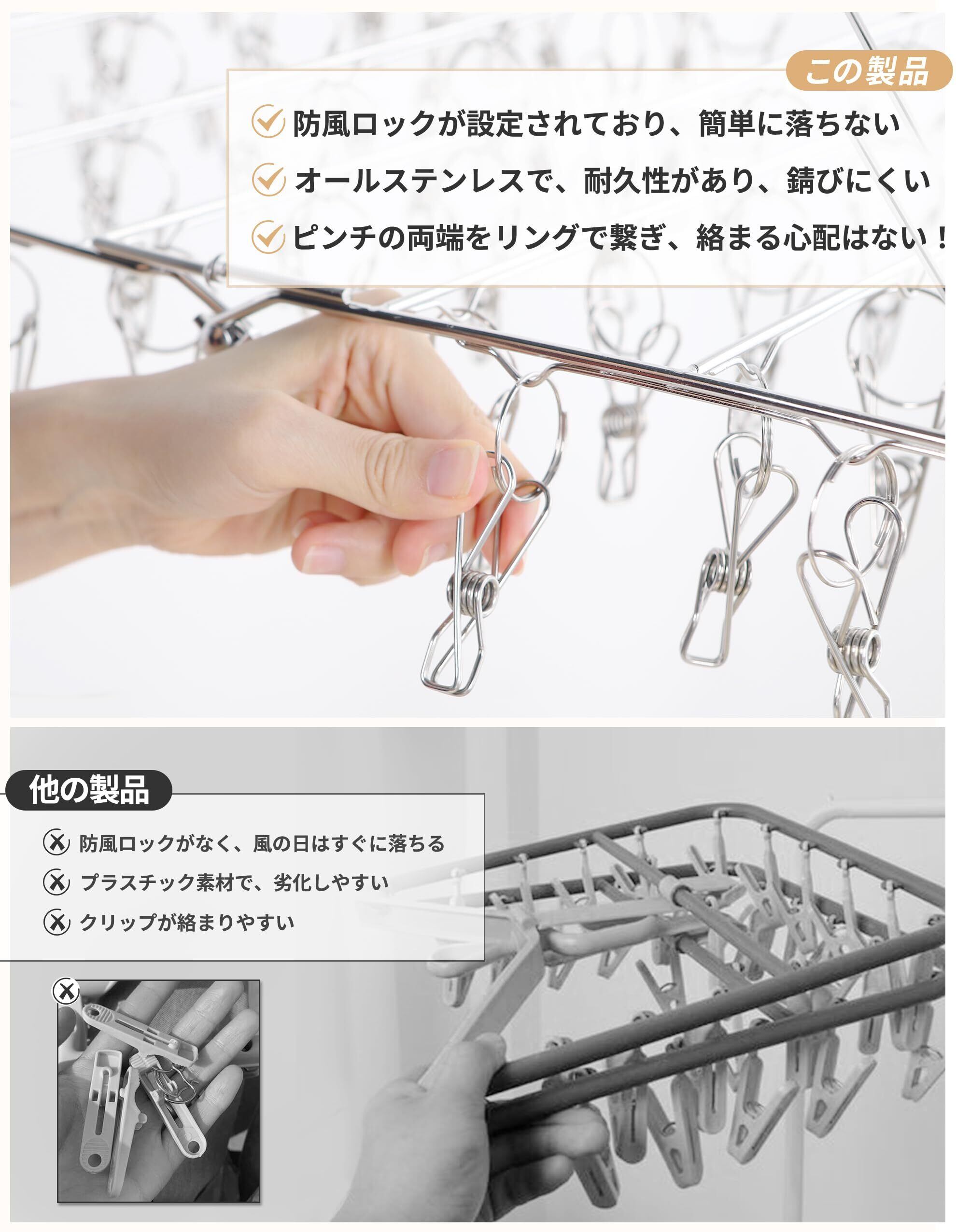 「耐久性と使いやすさのイイトコ取り」ピンチはオールステンレスで、シンプルながら洗練された美しさ、錆びに強く、強度も抜群、汚れも落ちやすく、手間もかからず楽々です。※重い洗濯物を挟む場合は複数のピンチを併用してください。
