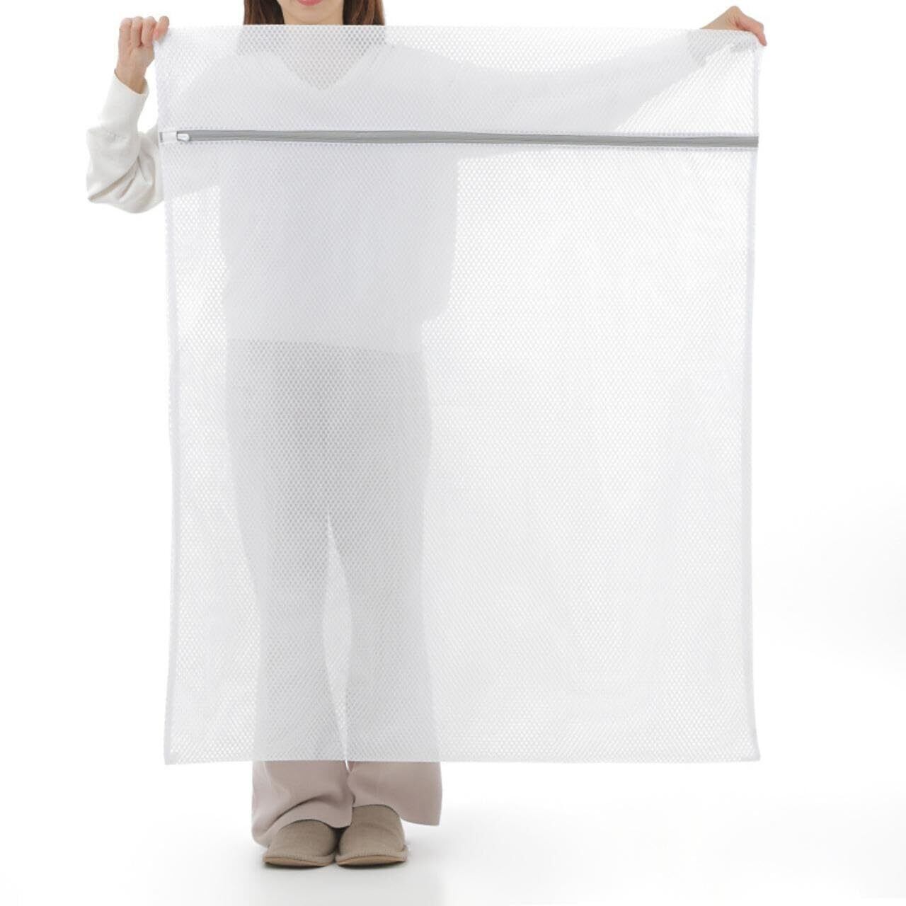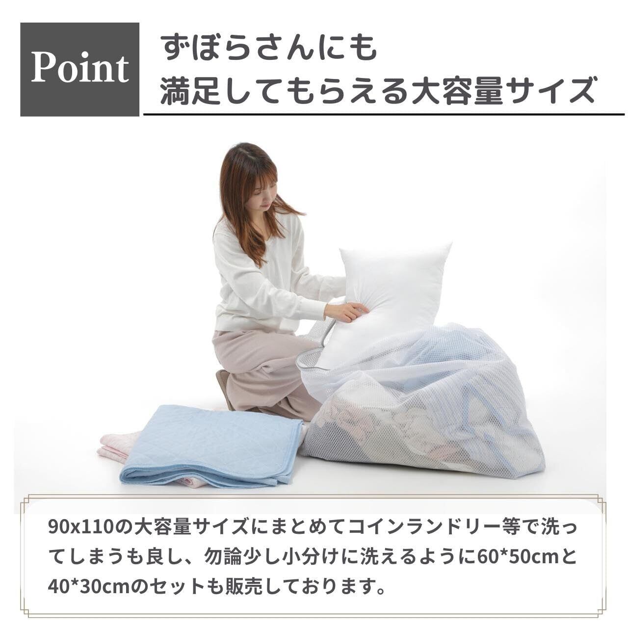 【超大型サイズ】90 x 110cm。布団や毛布も入れられる超大型サイズの洗濯ネットです。端まであるファスナータイプなので、大きい掛け布団や毛布などの出し入れも簡単です。洗濯機内部のダメージを抑えたり、洗濯中でファスナーが開くのを防ぐファスナーカバー付きです。ドラム式洗濯機や縦型洗濯機、コインランドリーでも勿論使用可能です。