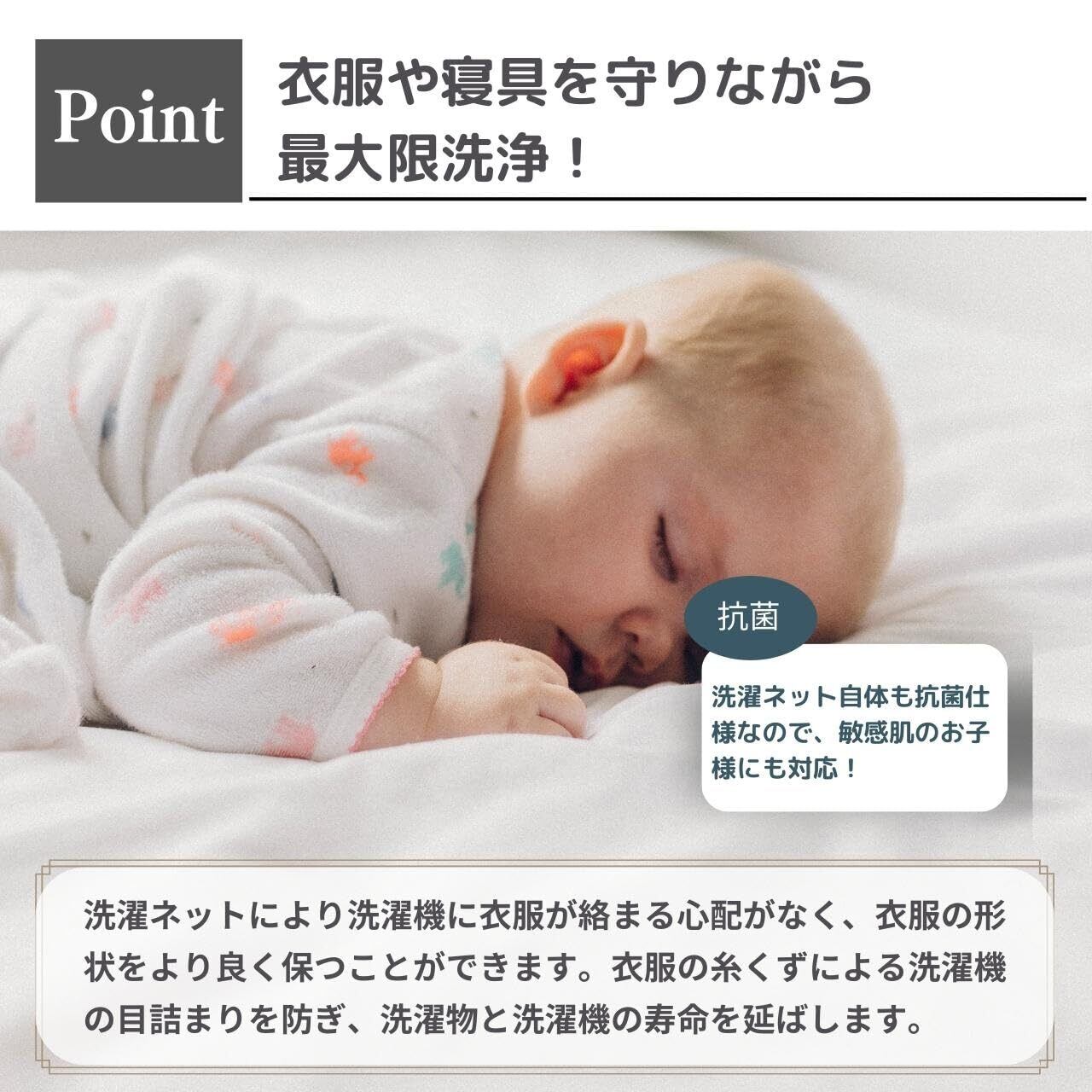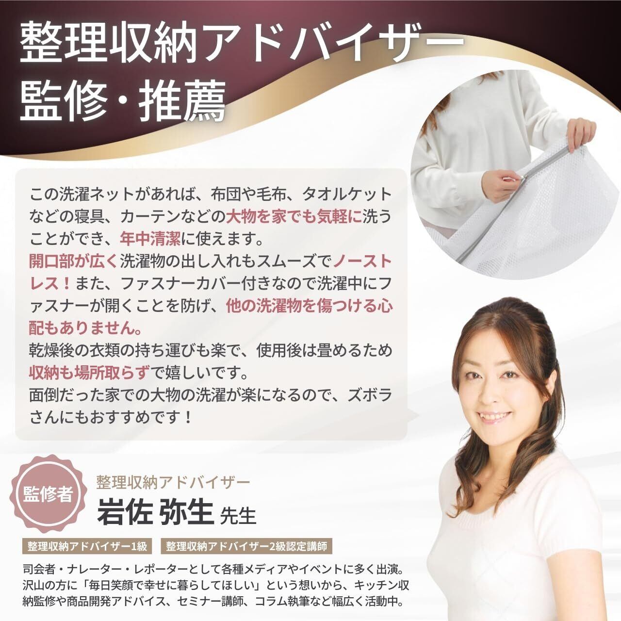 【特殊な網目】洗濯ネットの網目が粗いと中の衣類・寝具に糸くずがつきやすく、網目が細かいと水を通しにくく洗われにくいことをご存知でしょうか。Lamilyの洗濯ネットは、粗い網目と細かい網目を組み合わせて、両方の良いとこどりを取ることに成功しました。しっかり中まで洗えて、糸くずもつきにくくなっており、これまでの悩みが解消された洗濯ネットになります。