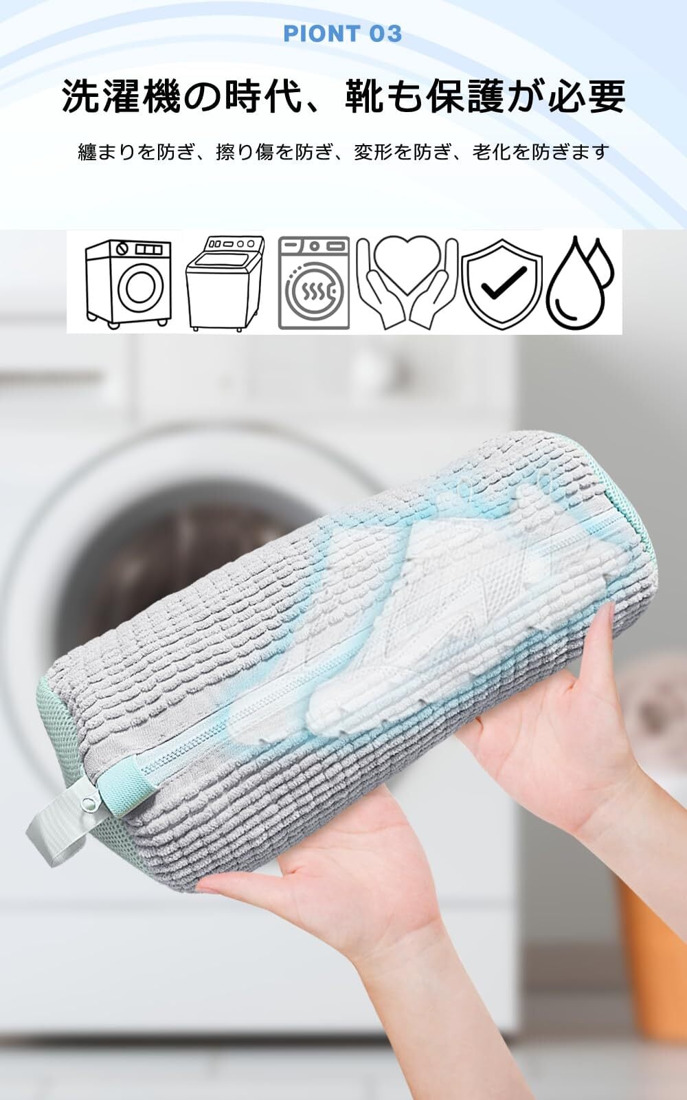 【Model SN2025|クッション構造で衝撃・騒音を軽減】 Model SN2025は、ネット全体に厚手のクッション材を内蔵し、洗濯中のドラムの衝撃や音をやわらげる静音設計。靴の形を崩さず、他の洗濯物や洗濯槽を傷つけにくい設計です。外側は粗めメッシュ生地で水流がしっかり通り、頑固な汚れにも対応。さらに、素材自体の耐久性も高く、10,000回以上の使用に耐える構造となっています。