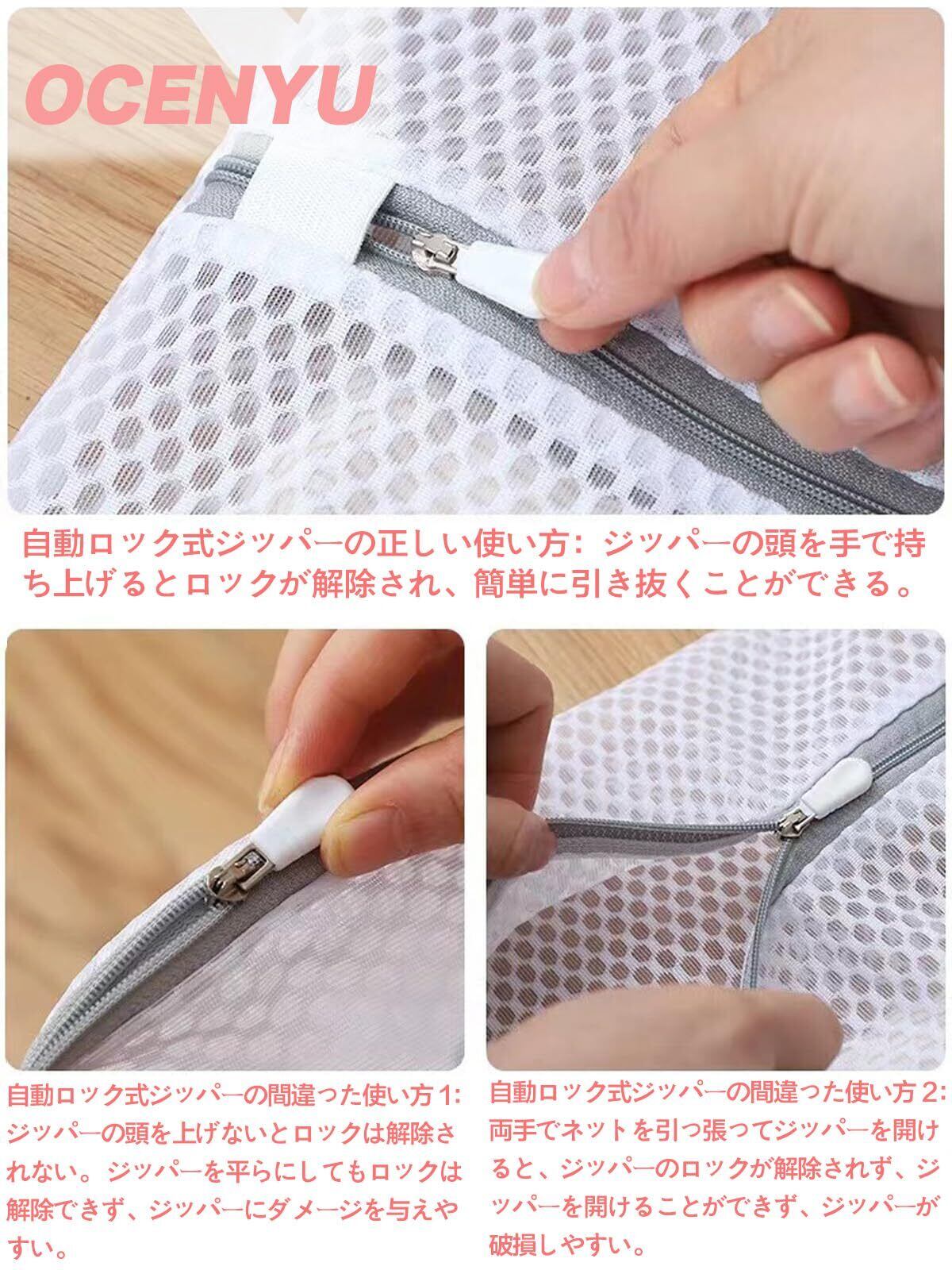 オートロックジッパー : OCENYU ランドリーネット おしゃれは、テスト済みの新しい自動ロック式ジッパーを備えており、1000 回使用した後でもスムーズにスライドします。ステンレス製のスライダーと高級感のある樹脂製のハンドルを組み合わせ、100円ショップの洗濯ネットと違い、高速回転させてもOCENYU 洗濯袋のファスナーが壊れず、洗濯時に衣類を傷めません。さらに、洗濯機でジッパー自体が他の生地と擦れるのを防ぐ特別なジッパー保護カバーを追加しました。