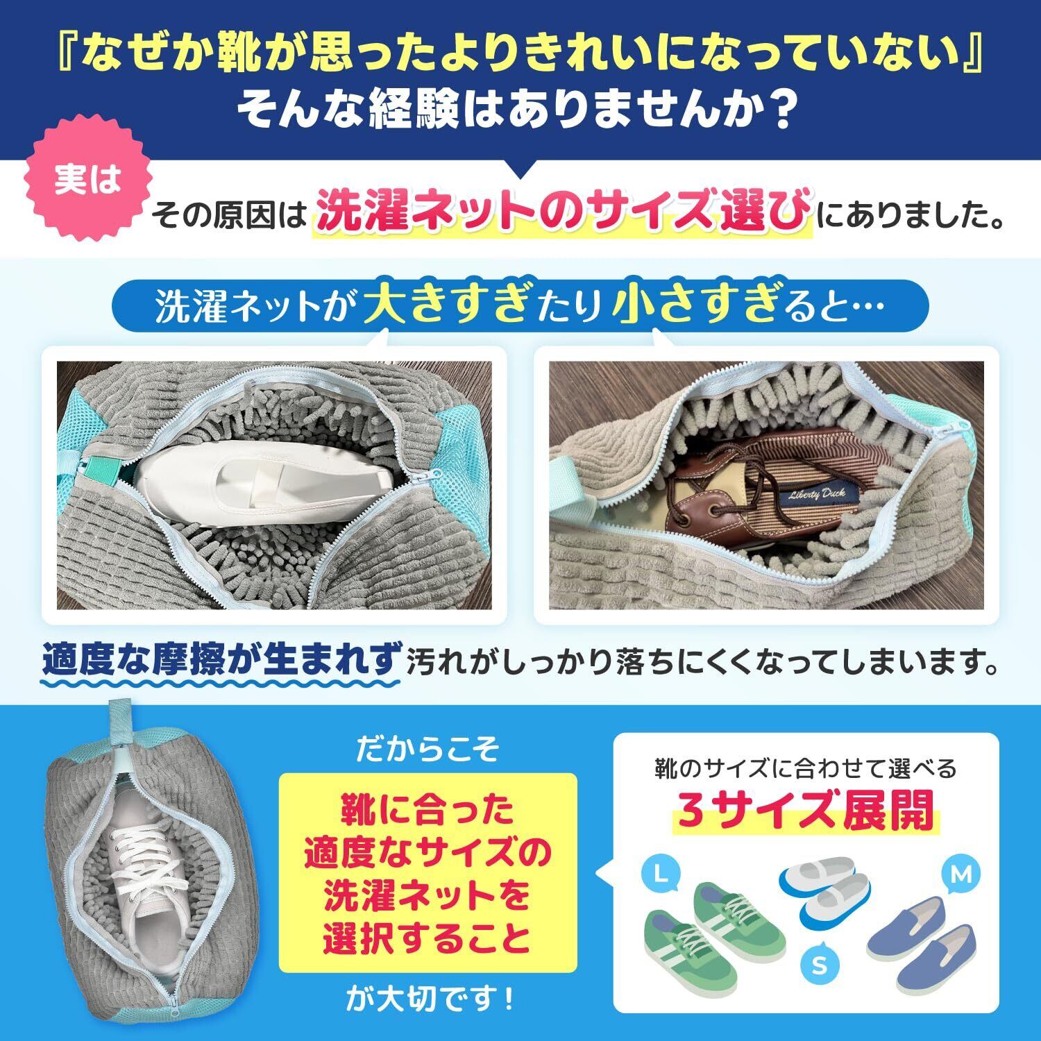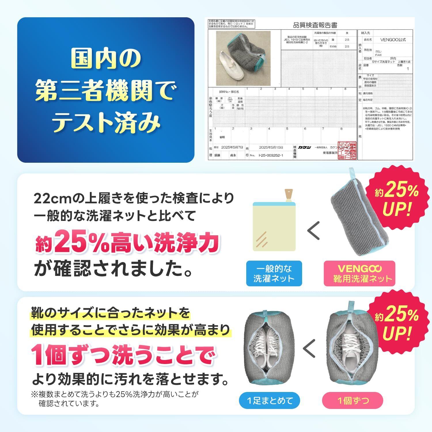 【性能検査済み】 第三者機関による検証で、通常の洗濯ネットや複数洗いより高い洗浄力が実証されました。 靴のサイズに合ったネットを使うことが、洗浄力アップのポイントです。
