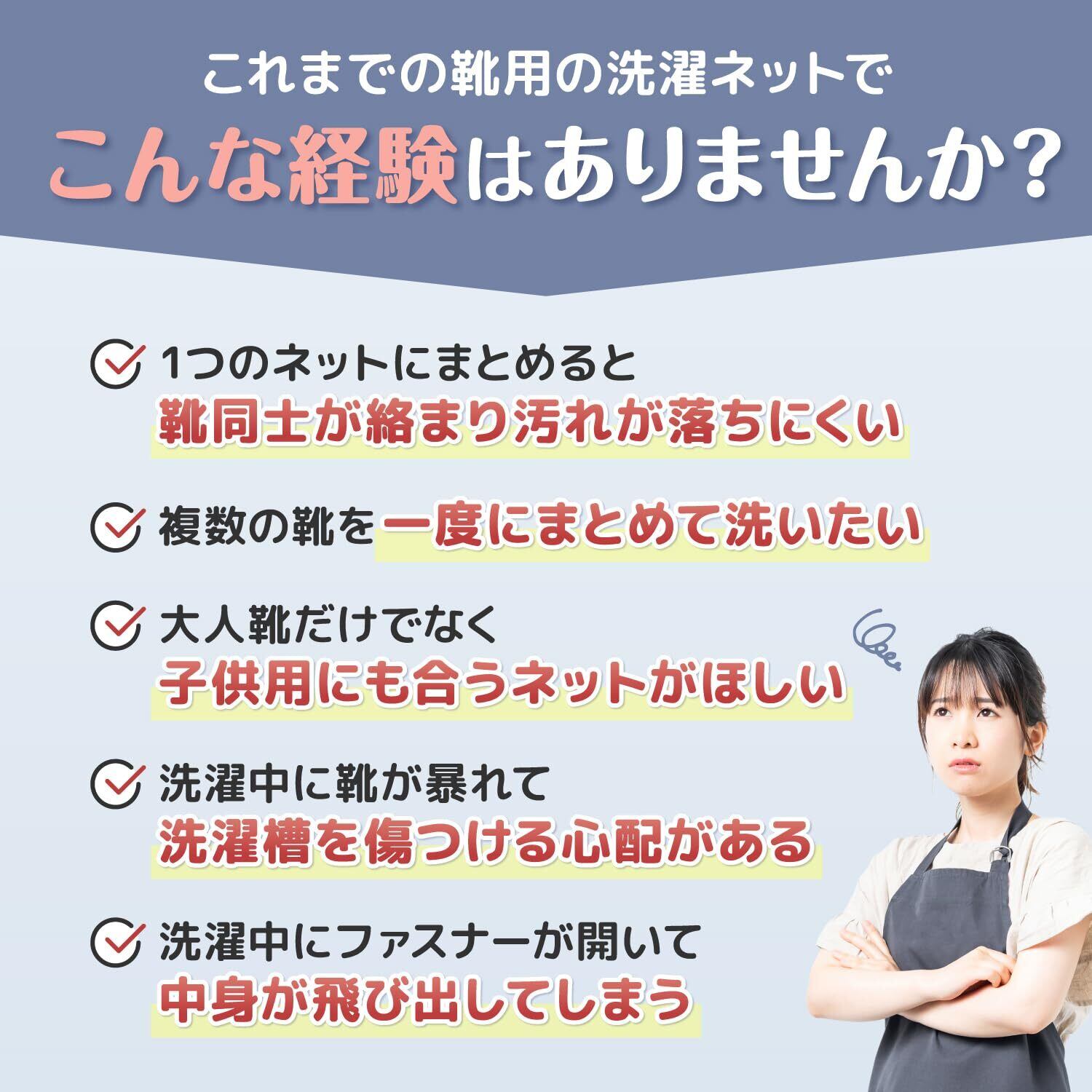 【手洗い不要】 「靴の手洗いが面倒…」そんな方におすすめ! 靴をネットに入れて洗濯機にポンと入れるだけ。 ネットが靴をやさしく包み、回転中の擦れ・引っかかり・型崩れ・色移り・破れなどを防ぎます。 ※スニーカー・上履き・運動靴などに最適!