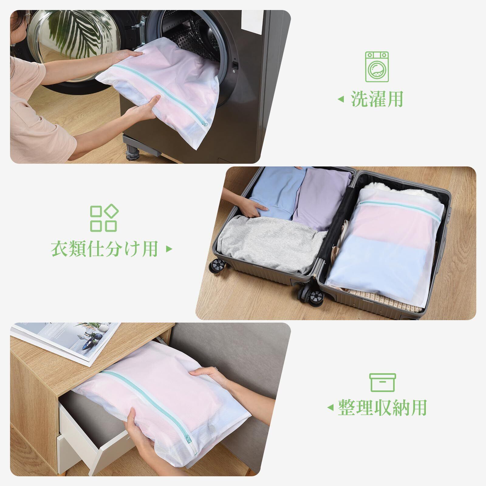 【多保護洗濯ネット】洗濯ネットとして、洗濯物の絡まりや損傷を防ぎ、衣類の摩擦を減らし、型崩れや色落ち・色移りを防ぎ、ホコリや糸くず付着防止、洗濯機の詰まりを防ぎ、洗濯物と洗濯機の寿命を延ばすことができます。コンパクトで、折りたたみでき、旅行や出張時の衣類仕分け袋や季節変化中の家庭用収納袋としても大活躍しています。