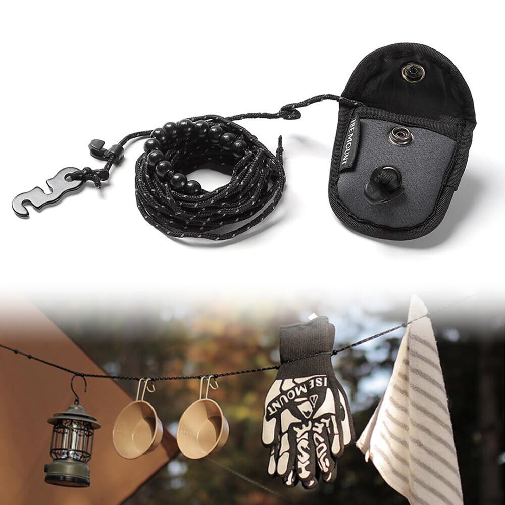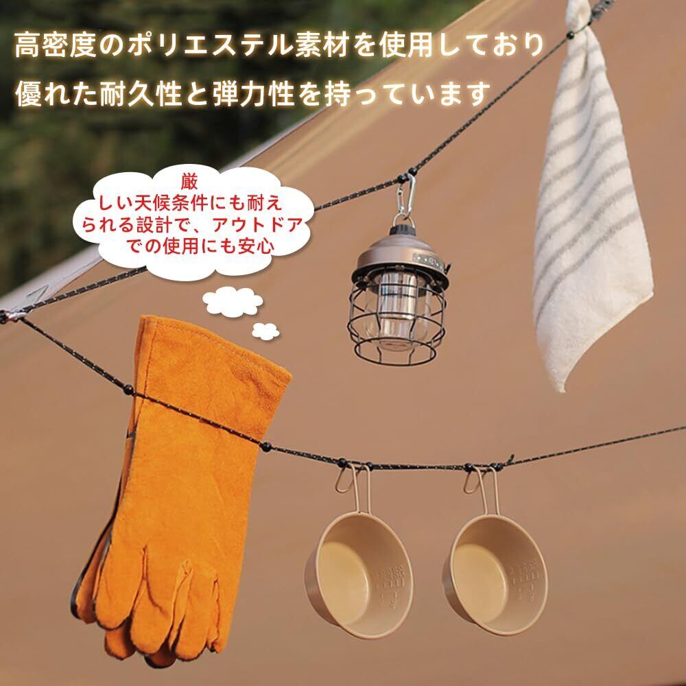 【多機能で幅広い用途】タオルや衣類はもちろん、キャンプ用品やその他のアイテムを干すのにも適しています。旅行先、バルコニー、キャンプ地など、さまざまな場面で活躍するこのロープは、アウトドア愛好者や旅行好きには欠かせないアイテムです。