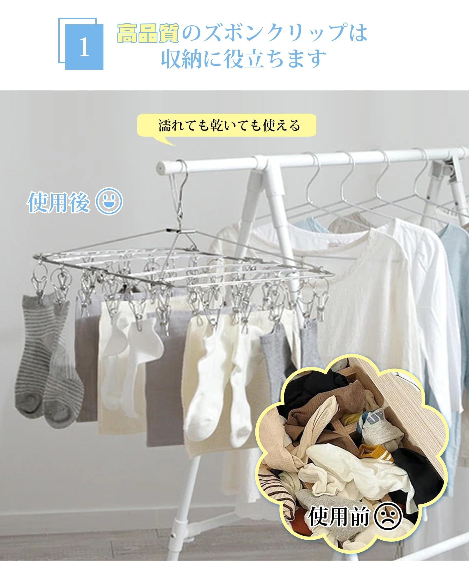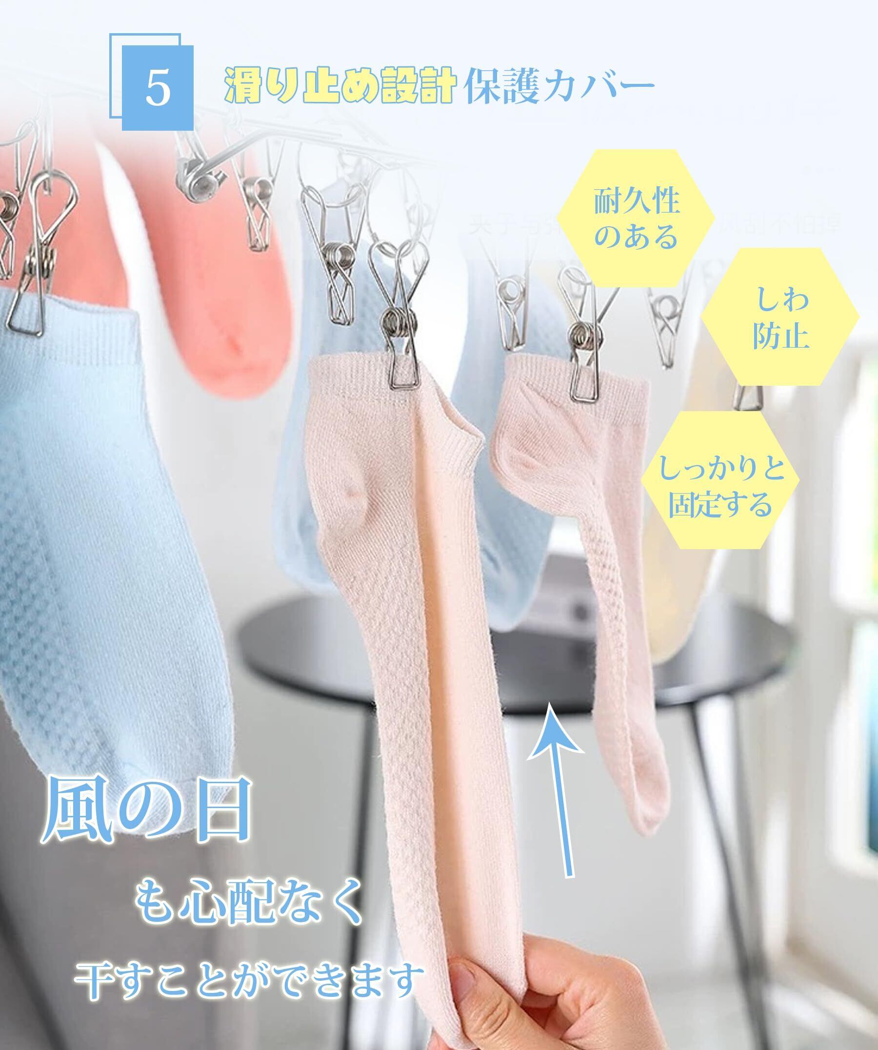 強風でも落下防止 & 防風設計 ステンンレス製ストッパー付きで、風の強い日でも竿から洗濯物ごと飛ばされる心配がありません。360°回転するフックで干しやすく、絡まりにくい構造(ステンンレスリング連結)でストレスフリーです。